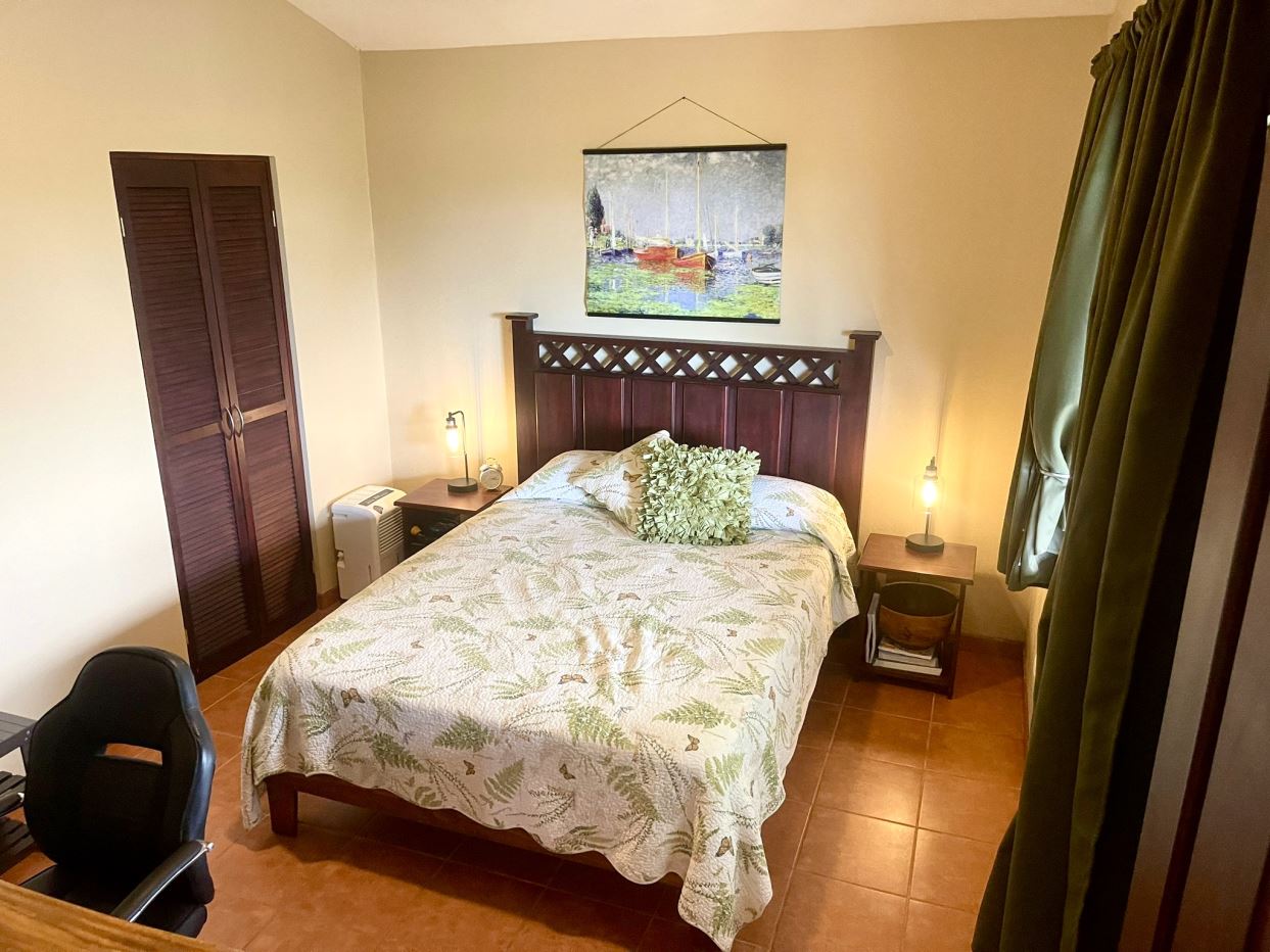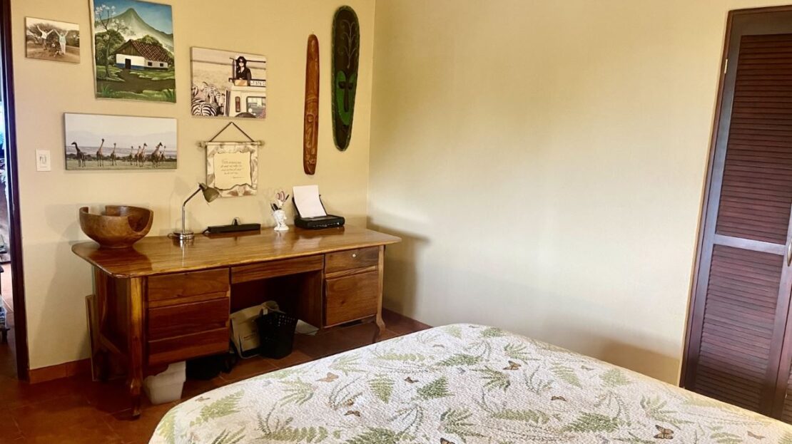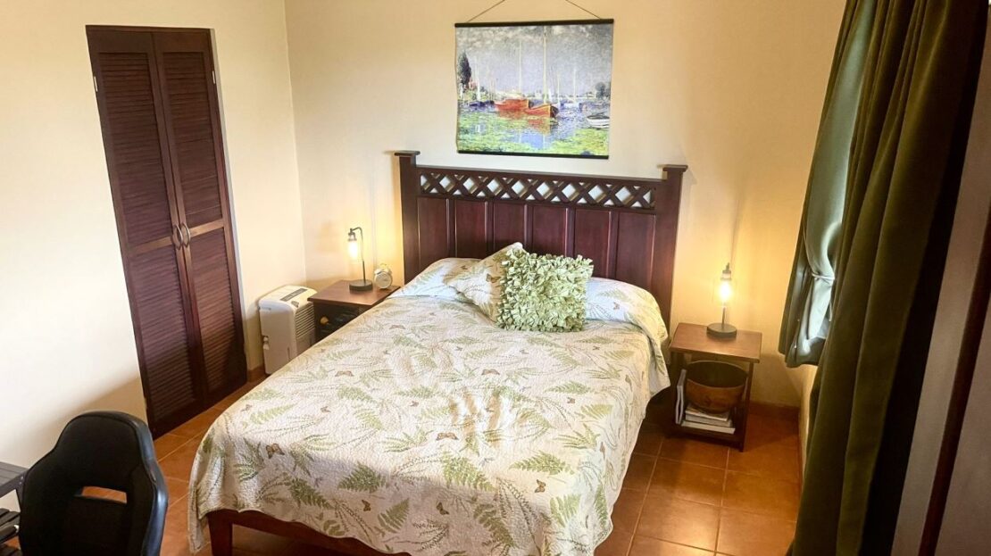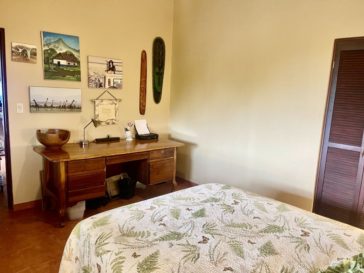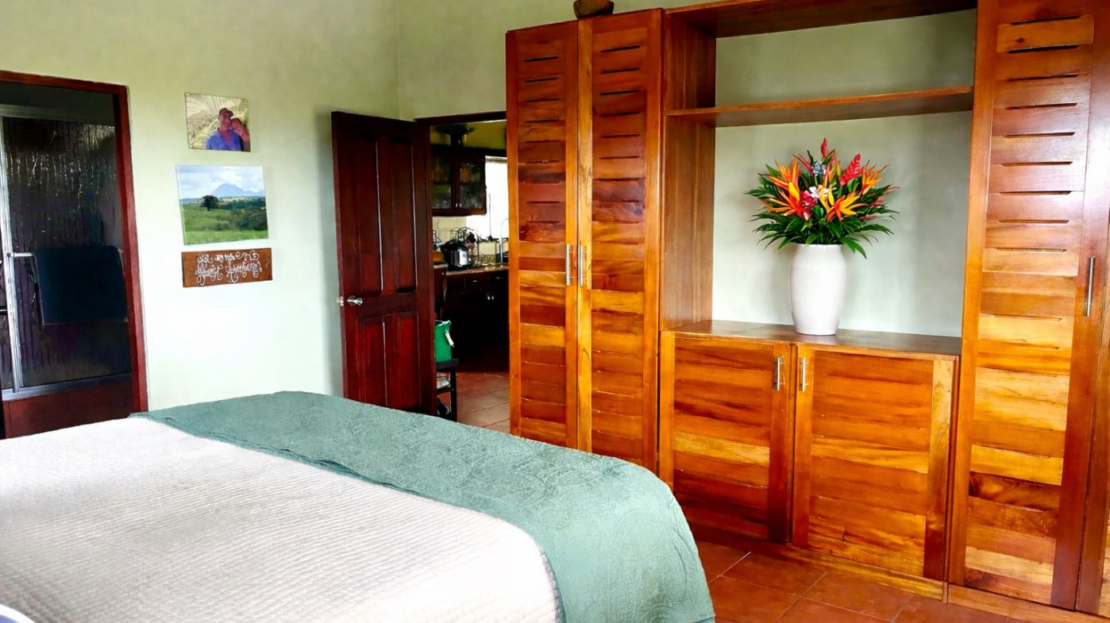 Moving from the open and welcoming living area, you step into the master suite, which offers both comfort and elegance. It features a recently installed custom cedar closet, an additional walk-in closet, a new air-conditioned wall unit, and picture windows overlooking the grounds and the Arenal Volcano. The spacious ensuite bathroom, with his and her sinks, as well as a bathtub and shower, offers comfort and convenience with a touch of luxury.