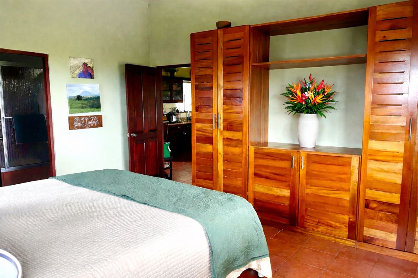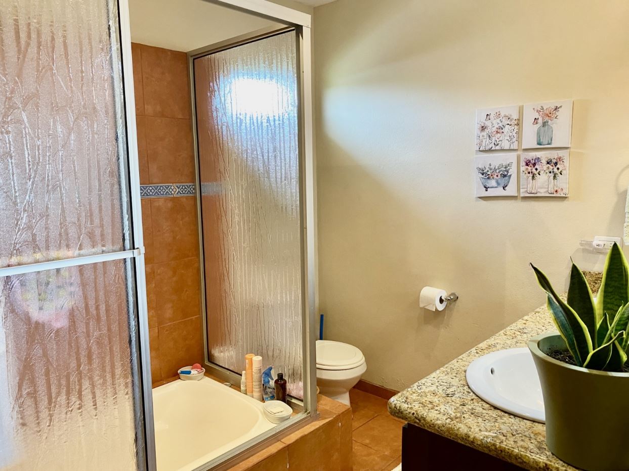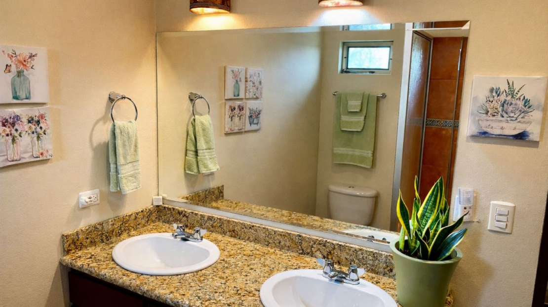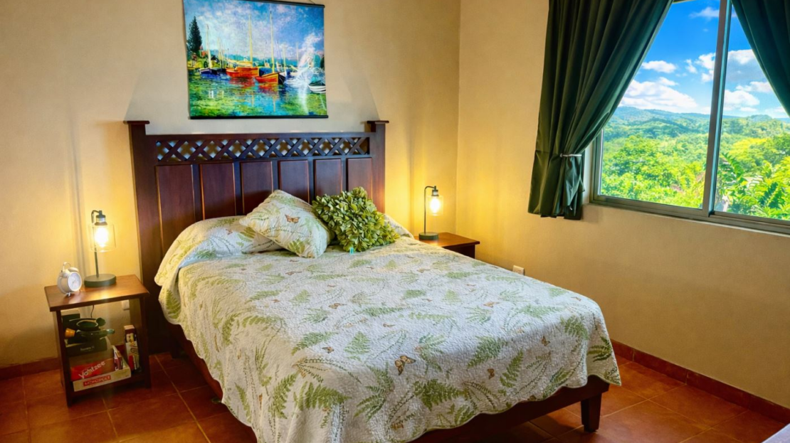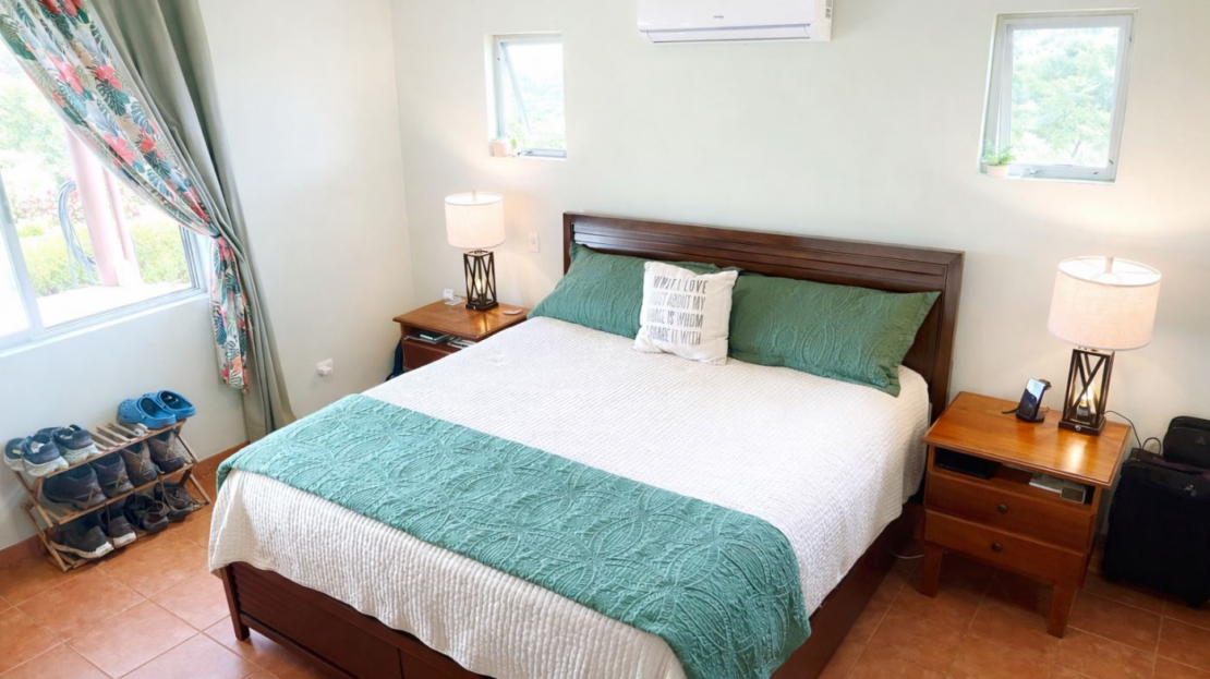 Moving from the open and welcoming living area, you step into the master suite, which offers both comfort and elegance. It features a recently installed custom cedar closet, an additional walk-in closet, a new air-conditioned wall unit, and picture windows overlooking the grounds and the Arenal Volcano. The spacious ensuite bathroom, with his and her sinks, as well as a bathtub and shower, offers comfort and convenience with a touch of luxury.