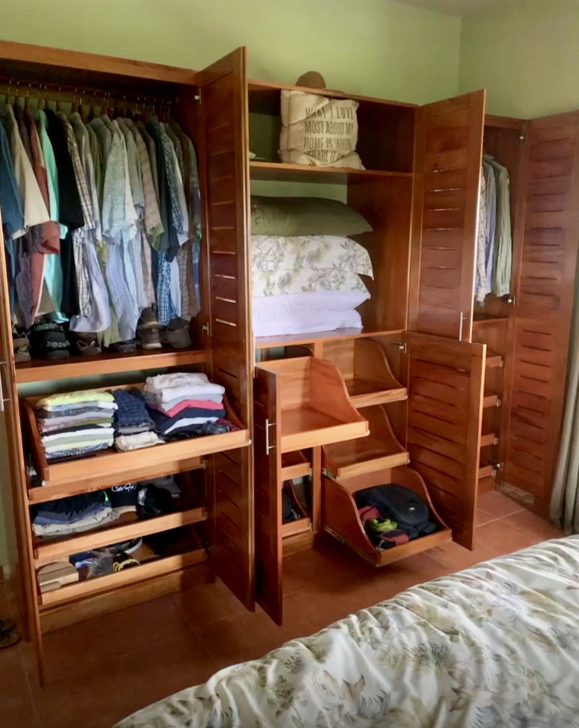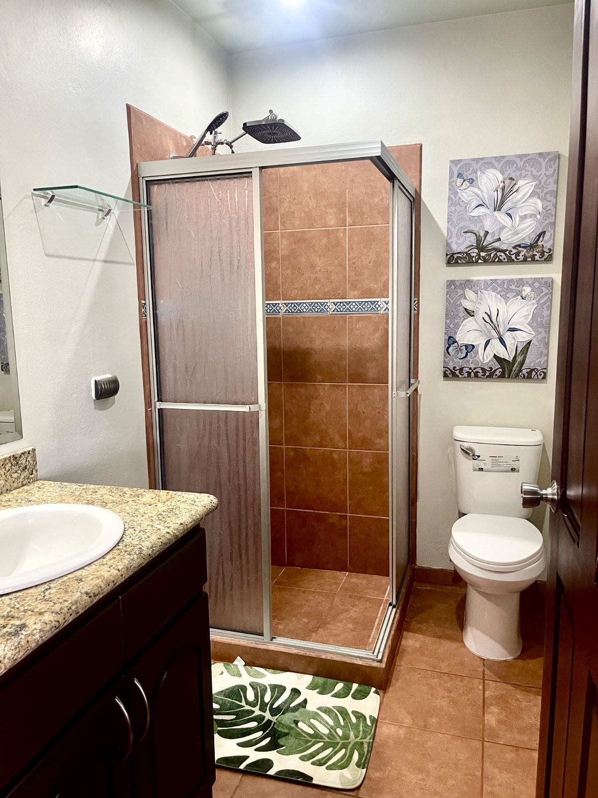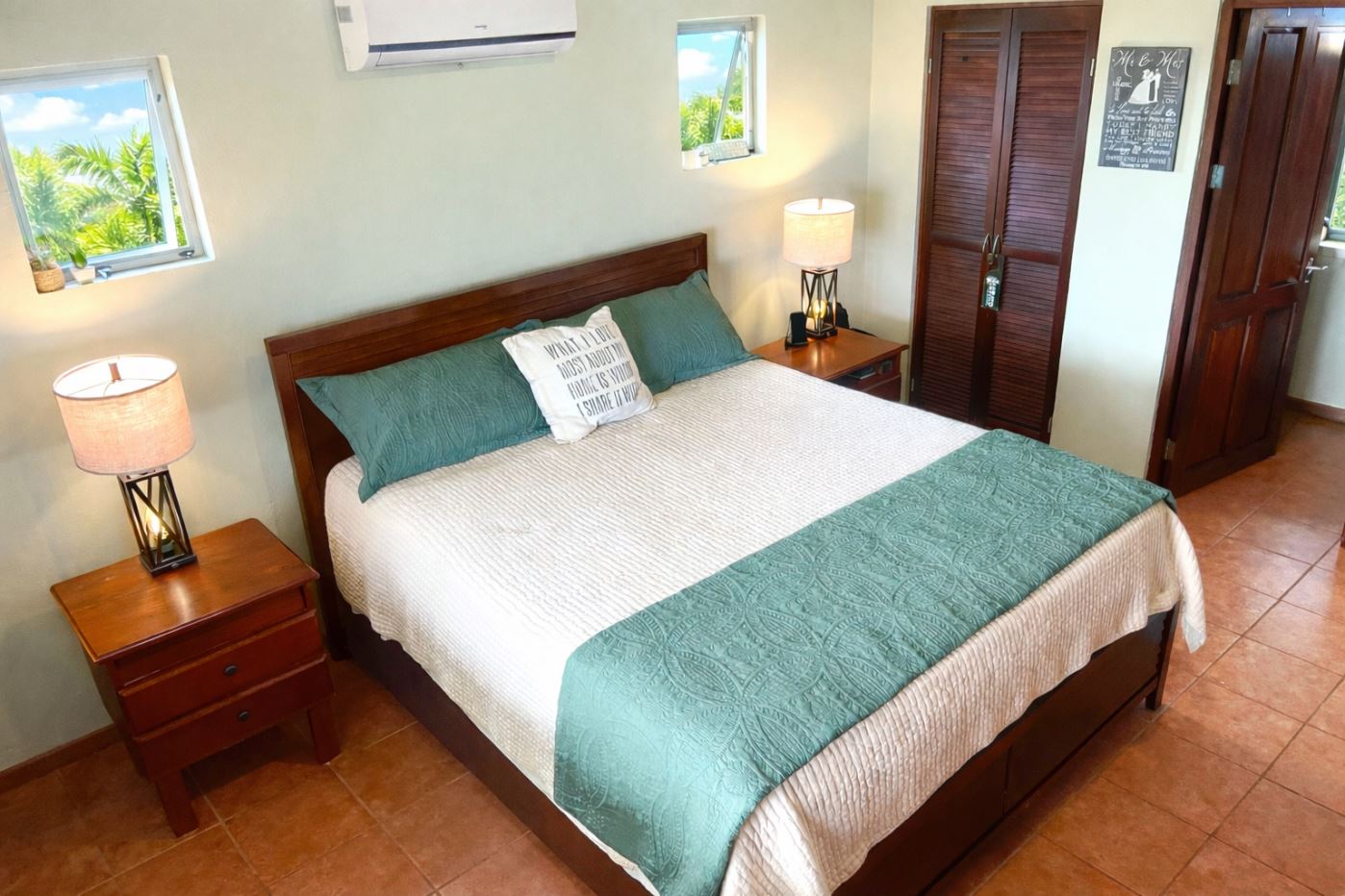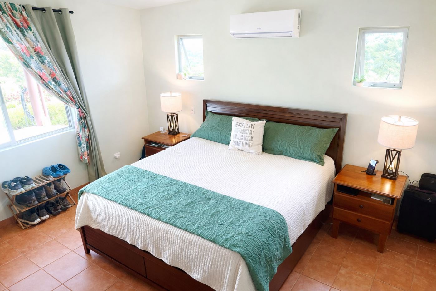 Moving from the open and welcoming living area, you step into the master suite, which offers both comfort and elegance. It features a recently installed custom cedar closet, an additional walk-in closet, a new air-conditioned wall unit, and picture windows overlooking the grounds and the Arenal Volcano. The spacious ensuite bathroom, with his and her sinks, as well as a bathtub and shower, offers comfort and convenience with a touch of luxury.