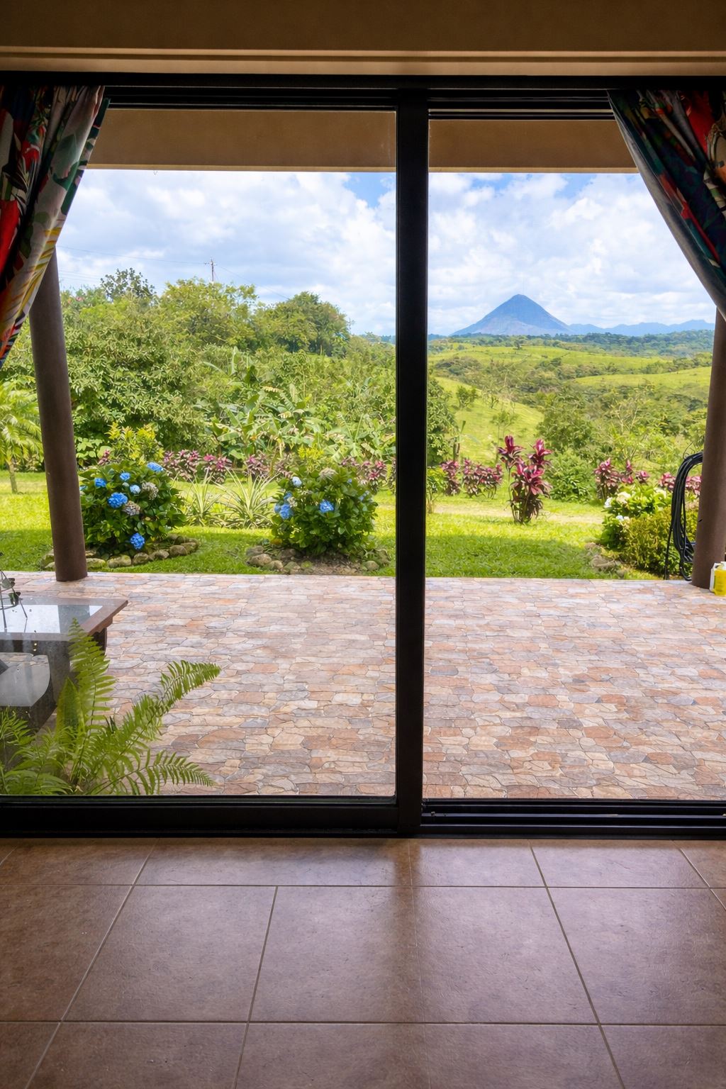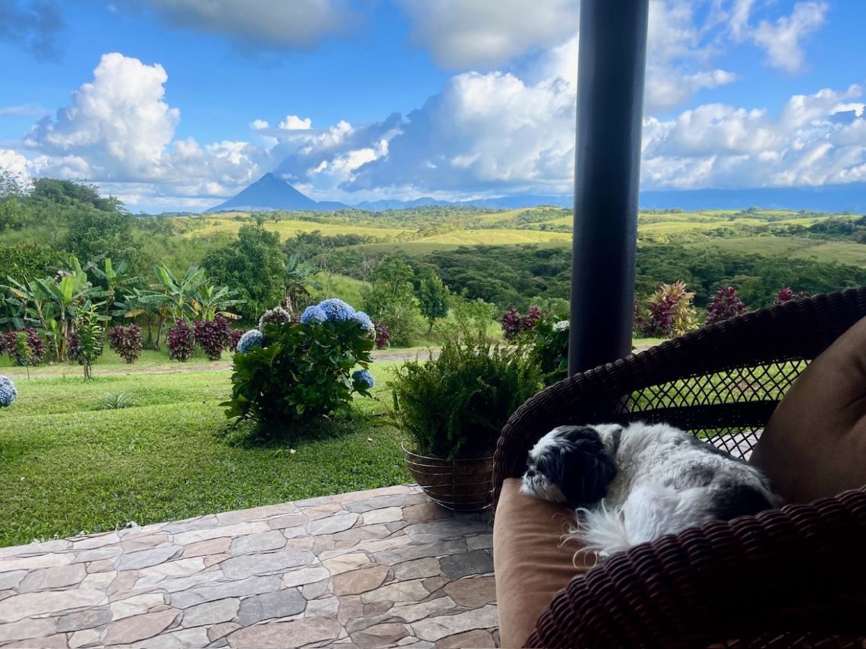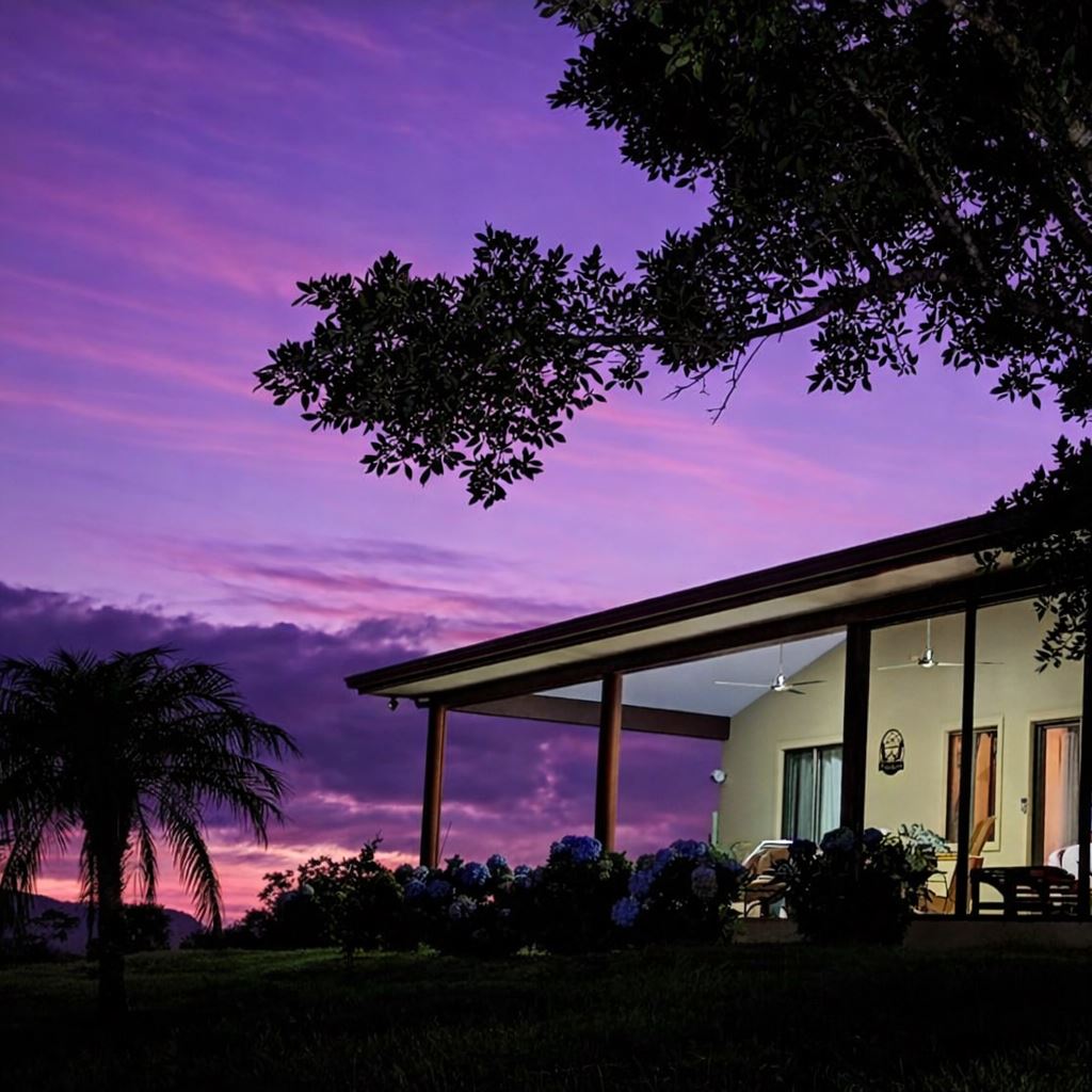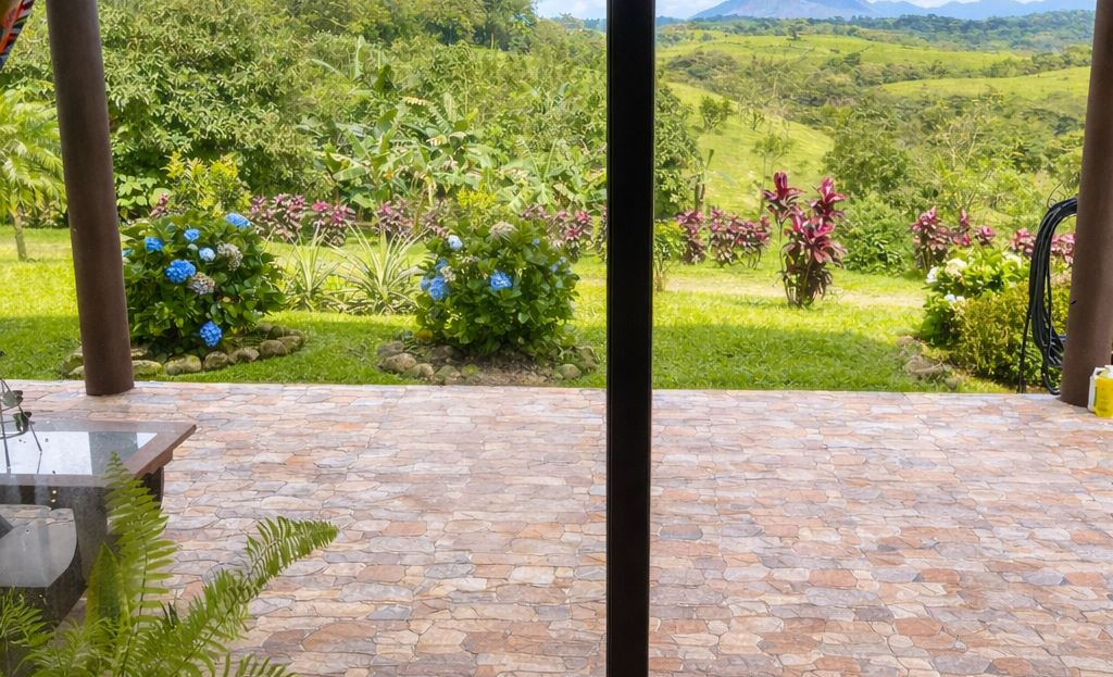 This cozy Costa Rican-style home sits on 1.65 acres within a tranquil gated community surrounded by estate properties and renowned for its panoramic views of the Arenal Volcano, Lake Arenal, lush valleys, and surrounding mountains. The grounds are alive with tropical beauty; mature fruit trees including oranges, lemons, tangerines, pineapples, mulberries, and bananas, alongside vibrant flowering plants that create a haven for toucans, monkeys, and other wildlife.