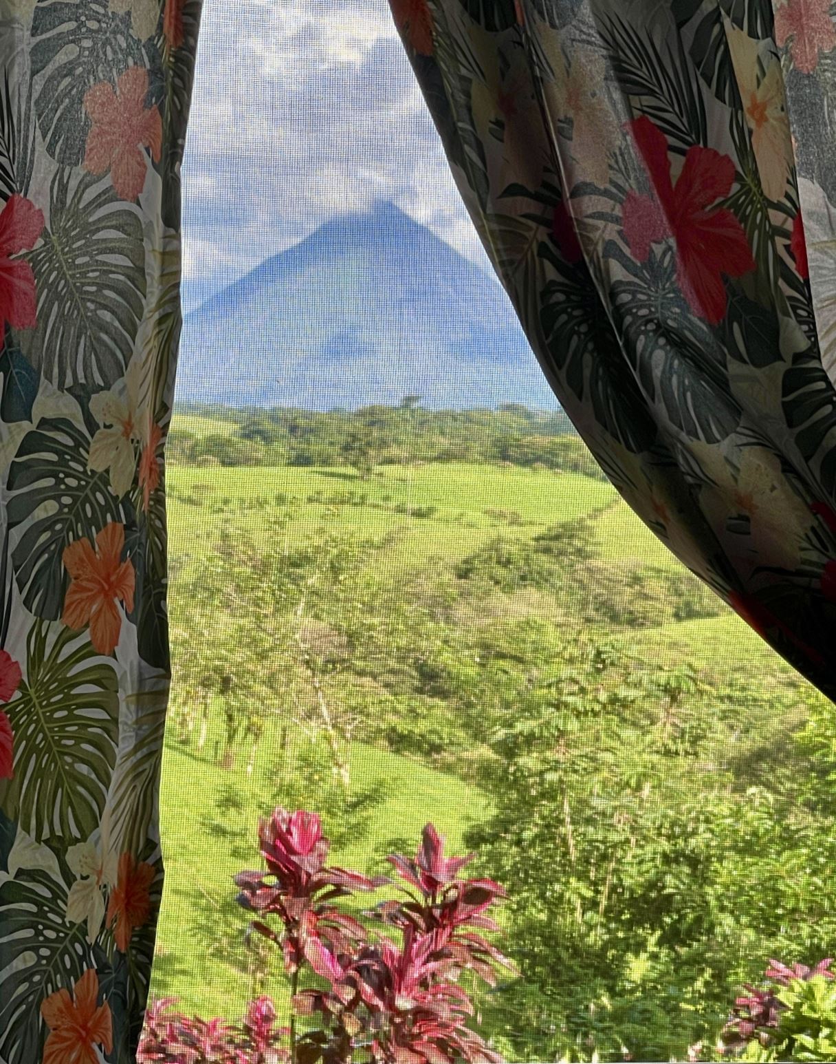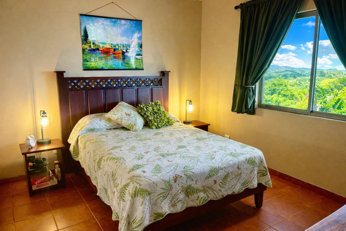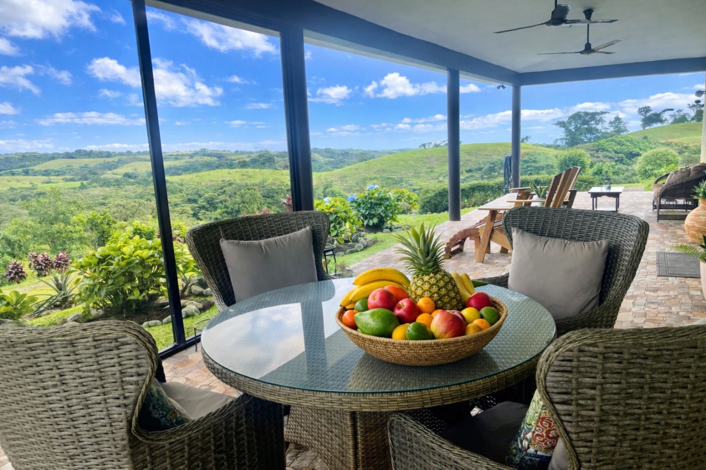 This cozy Costa Rican-style home sits on 1.65 acres within a tranquil gated community surrounded by estate properties and renowned for its panoramic views of the Arenal Volcano, Lake Arenal, lush valleys, and surrounding mountains. The grounds are alive with tropical beauty; mature fruit trees including oranges, lemons, tangerines, pineapples, mulberries, and bananas, alongside vibrant flowering plants that create a haven for toucans, monkeys, and other wildlife.