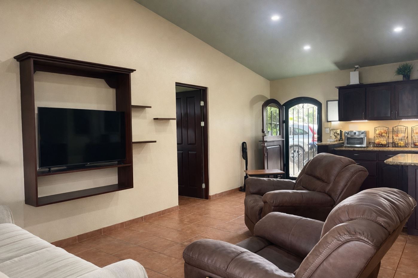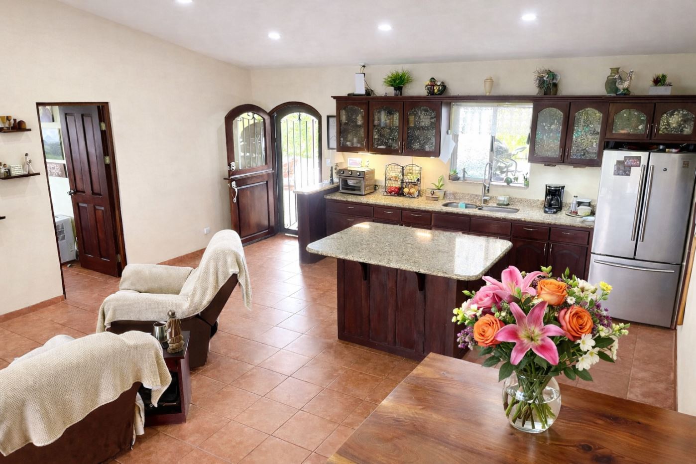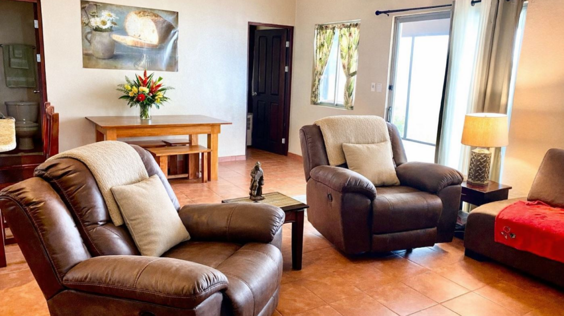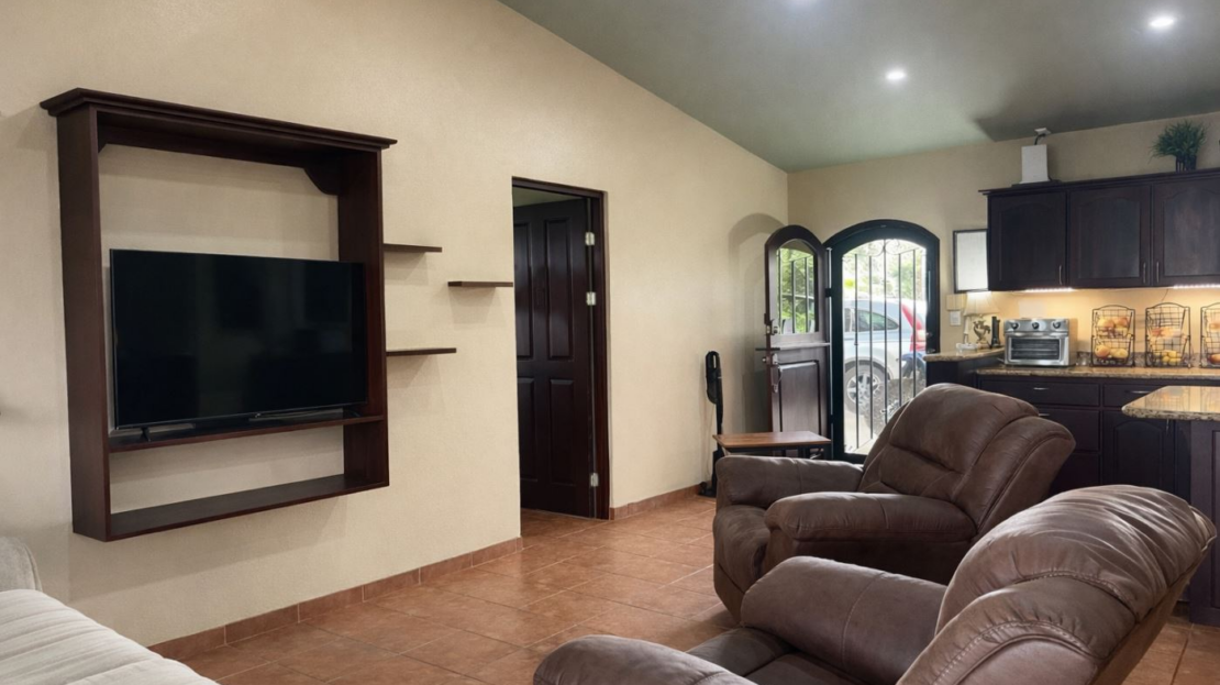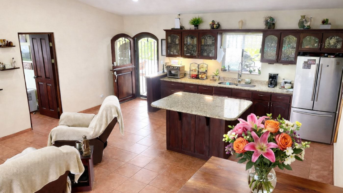 At the heart of the property is a charming two-bedroom, two-bathroom home of approximately 1,200 sq. ft., thoughtfully designed with Costa Rican character. The home features an open-concept layout with vaulted ceilings, creating a spacious and airy atmosphere.