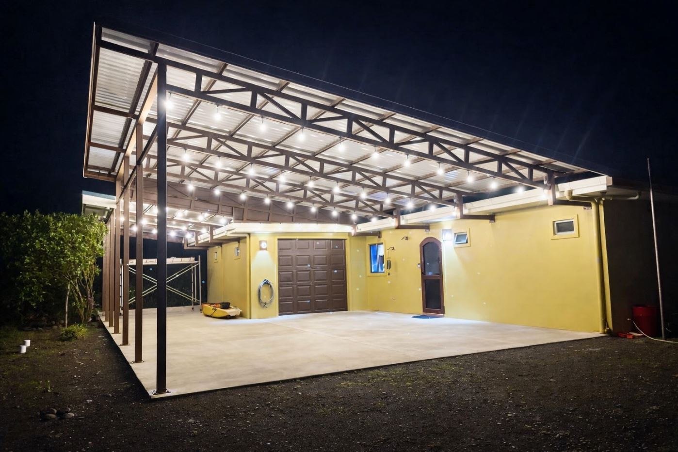 The property is further complemented by an impressive 1,000 sq. ft. carport, which can accommodate up to four vehicles. Outfitted with beautiful lighting, this versatile space is ideal for entertaining and holds great potential to be expanded into a large social area with an outdoor kitchen and barbecue facilities. A curved driveway enhances accessibility, while a covered garage provides storage, accommodates one vehicle, and currently functions as a workshop.