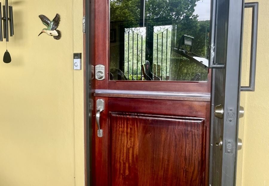 Patio doors, fitted with a new decorative metal detail for added security, open into the home’s bright and spacious 625 sq. ft. atrium lounge. This is undoubtedly one of the most exceptional areas of the property, and very likely the most used. One side of the atrium is enclosed by glass walls, creating a light-filled dining area where you can enjoy meals al fresco, rain or shine. The other side is open, with multiple seating areas for relaxation and entertaining that flow directly onto the meticulously manicured grounds. Outfitted with high-quality furnishings, the atrium blends elegance with comfort, making every gathering a special experience.