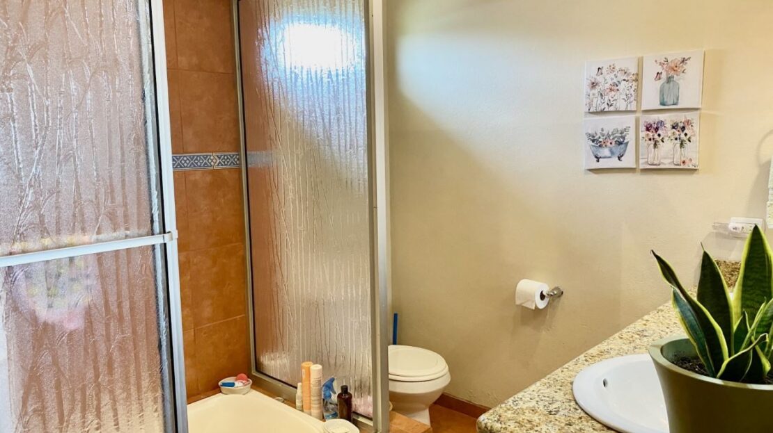 On the opposite side of the home, you’ll find a comfortable guest bedroom with ample space and flexibility, making it ideal as a guest suite, a home office, or both. A bright, well appointed bathroom is also located here, providing comfort and convenience for guests.