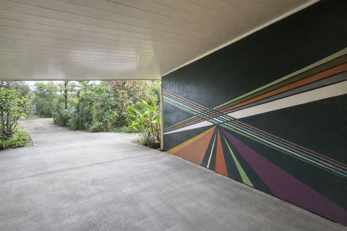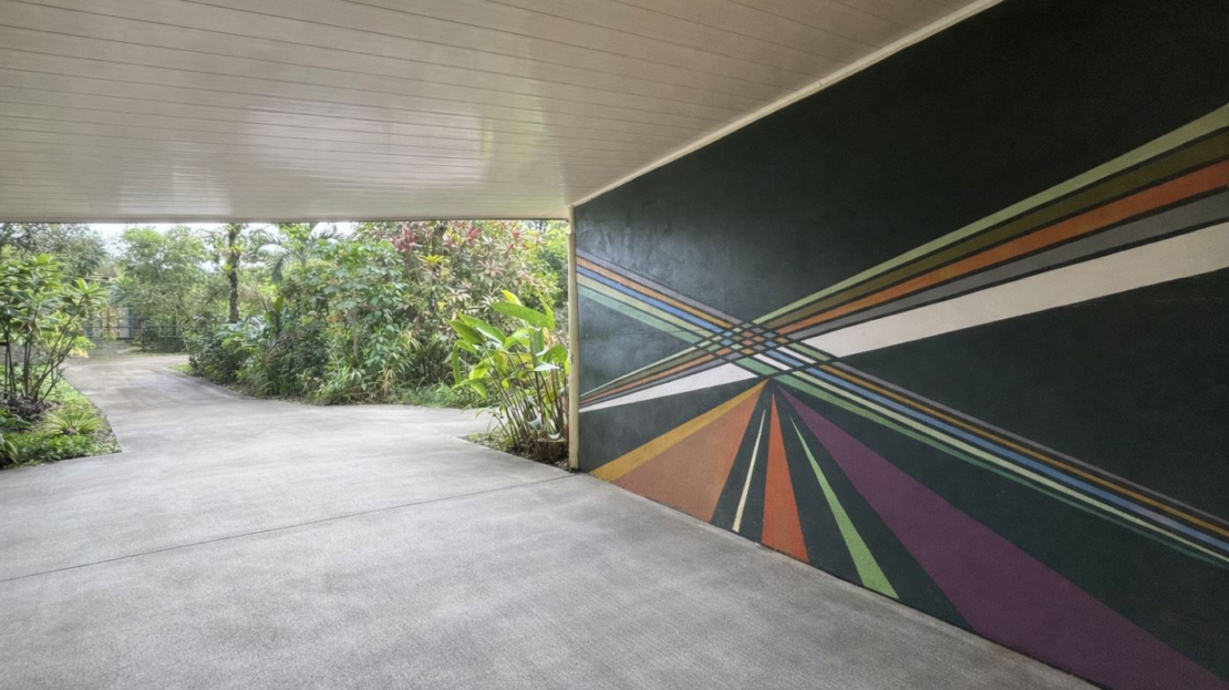 Access to the fully fenced property is through an electric gate, opening to a long driveway bordered by mature gardens and layered landscaping. The drive leads to a large covered carport, which could easily be enclosed to create a finished garage if desired.