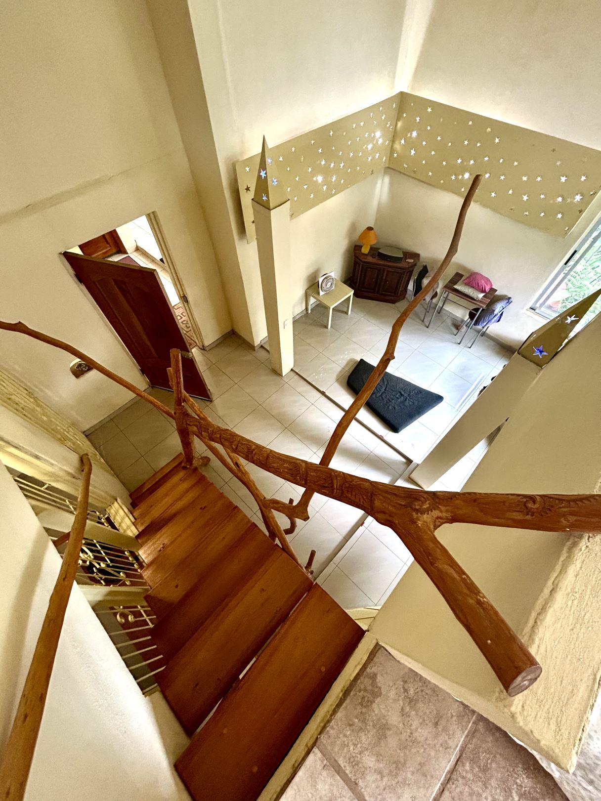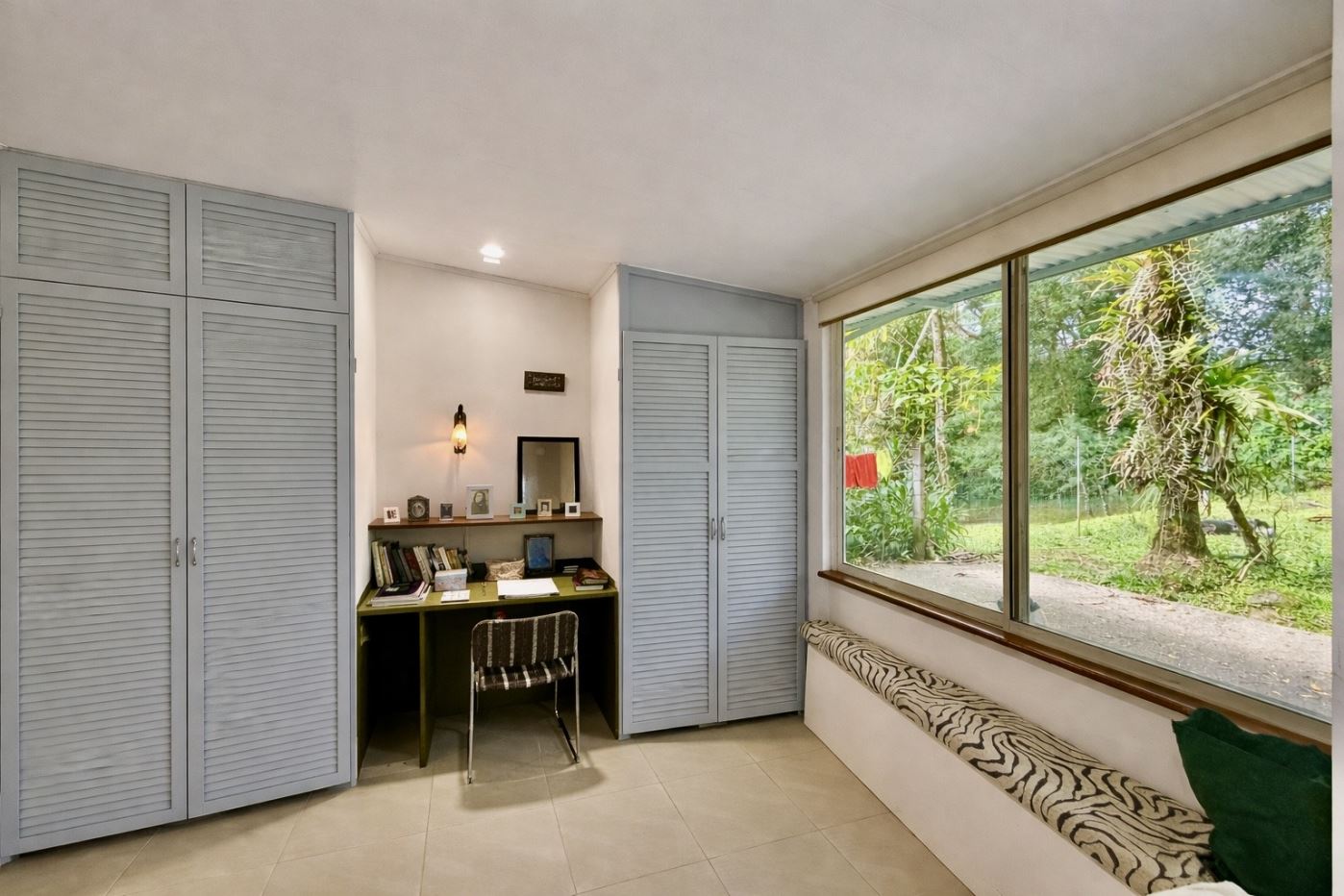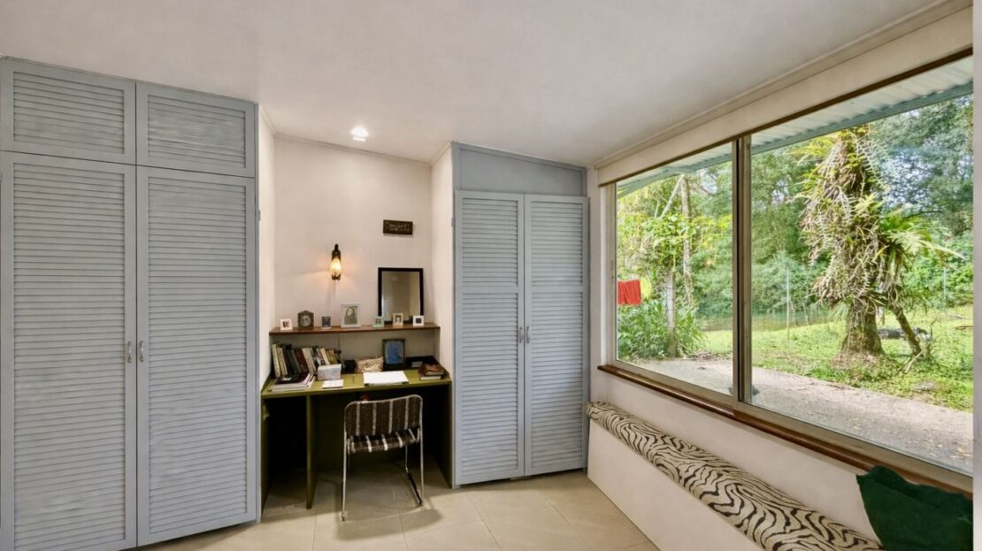 An ornate wood staircase rises from a reception area upon entry into the home, and leads to a cozy loft area currently used as a guest bedroom. Overlooking the gardens, the space enjoys beautiful views and abundant natural light, making it equally well suited as an office, studio, gym, or quiet retreat. Built-in storage enhances its functionality, offering thoughtful use of the vertical space.