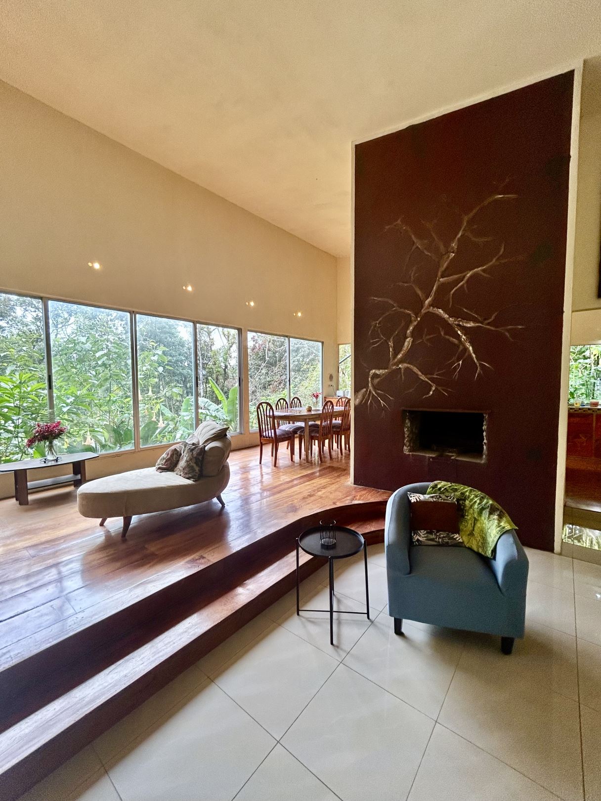 Inside, the home reflects warmth and individuality. Soaring ceilings create a sense of light and volume, complemented by beautiful tile and hardwood flooring throughout. The focal point of the home, and its defining architectural feature, is the living and dining area, framed by wall-to-wall windows. The space creates a conservatory-like atmosphere, with uninterrupted views that visually extend the living area into the surrounding gardens. At the center, a wood-burning fireplace anchors the layout, subtly separating the living area from the kitchen. The kitchen features generous picture windows overlooking the rear garden, keeping the space bright and open. The generous proportions of this integrated living and dining space allow for multiple seating arrangements and distinct conversation areas, making it equally suited to quiet evenings or entertaining guests. The dining area features a built-in buffet hutch, offering both storage and a practical serving station when hosting.