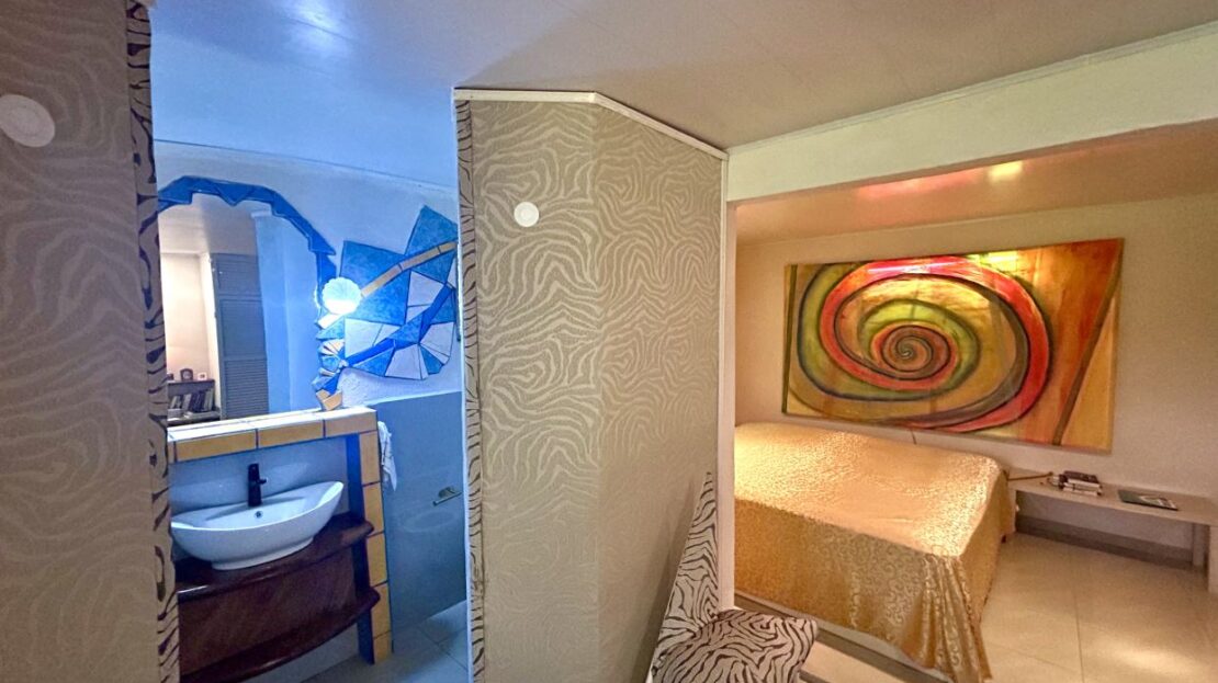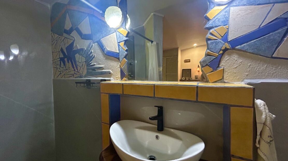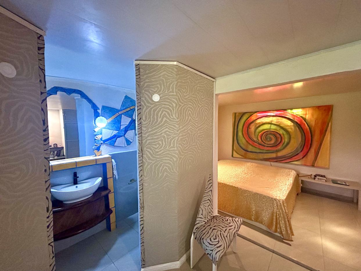 Currently arranged as a two-bedroom, two-bath residence with an additional half bath, separate shower room, and loft, the flexible layout allows for thoughtful reconfiguration into three or even four bedrooms if desired. The residence is being offered fully furnished, including curated furnishings and distinctive statement wall art that complement the character of the interiors.