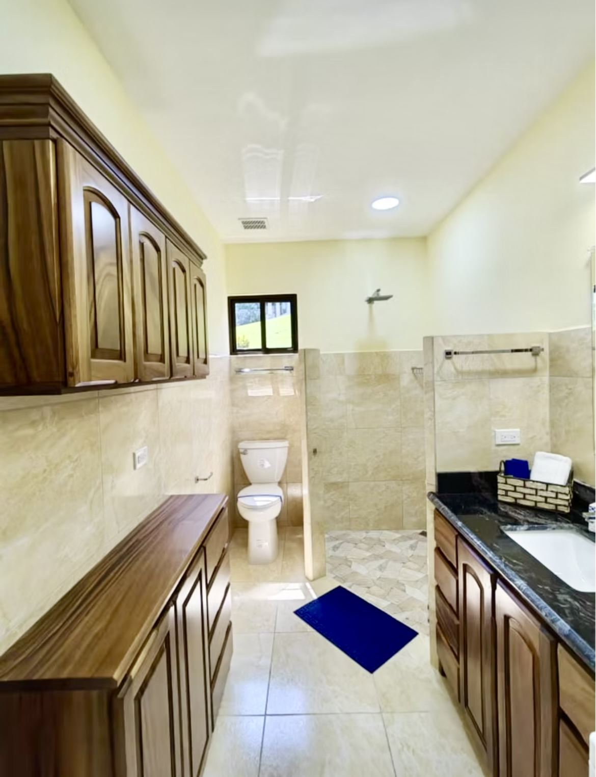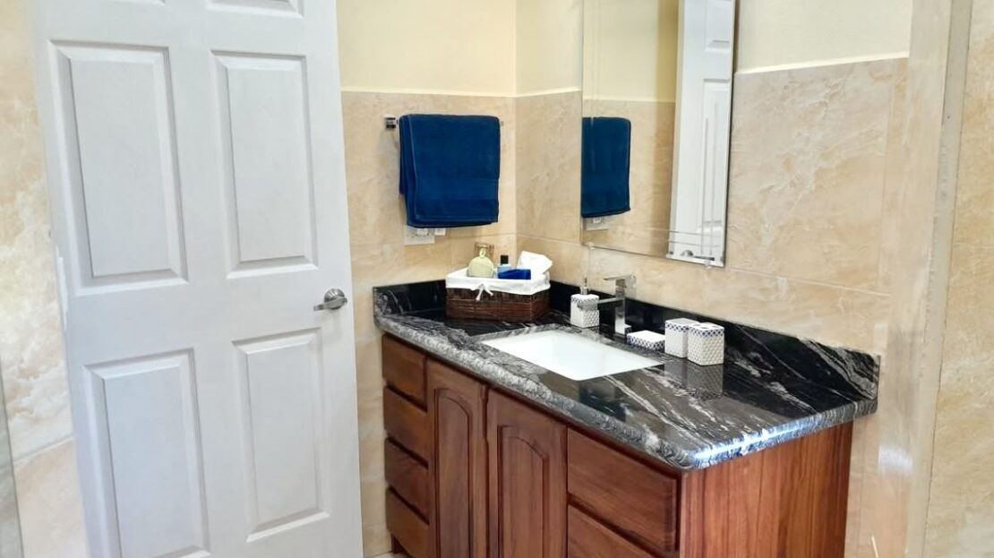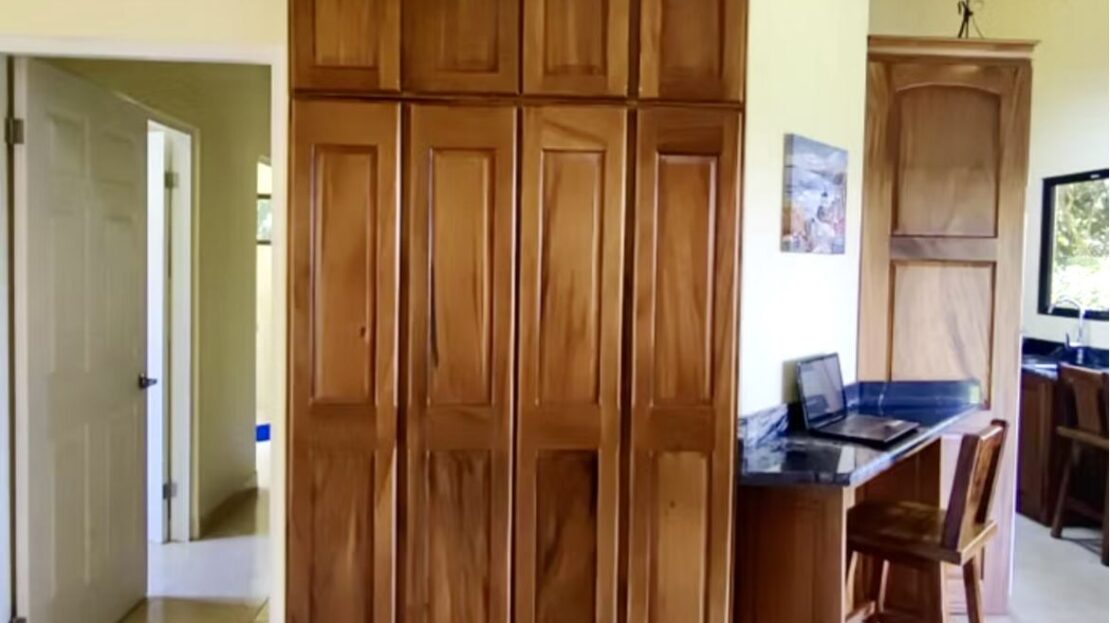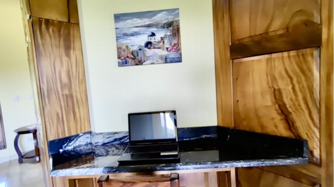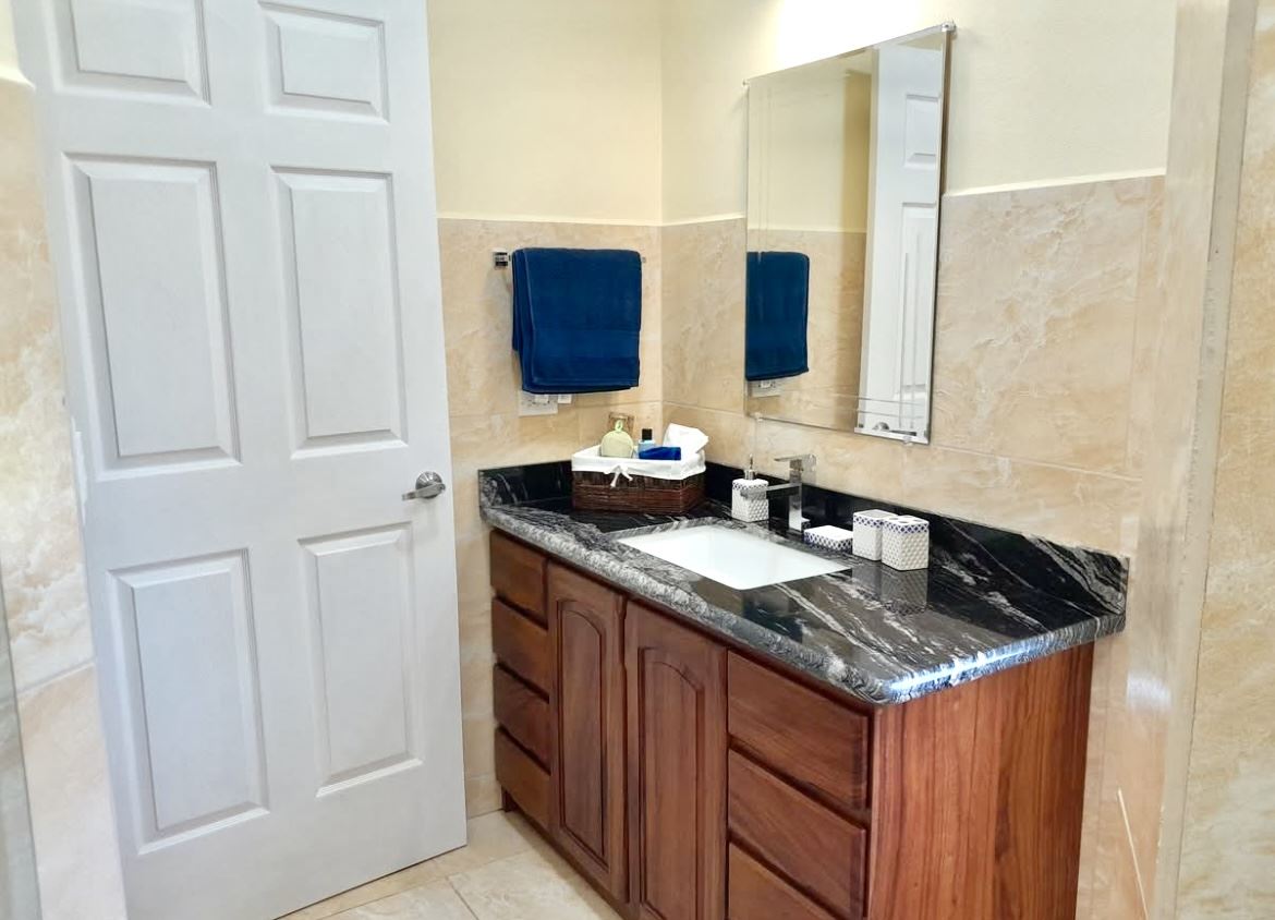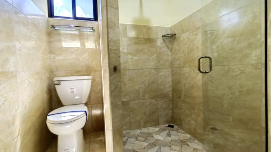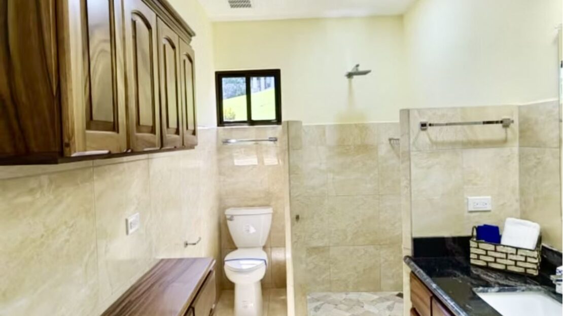 The master suite includes a luxurious ensuite bath with a walk-in shower, in addition to a cozy nook/sitting area overlooking the lake where one can reflect on the day while taking in the glorious lake sunsets. A second full bathroom serves the spacious guest suite and includes Guanacaste cabinetry, as well as in-home laundry facilities.