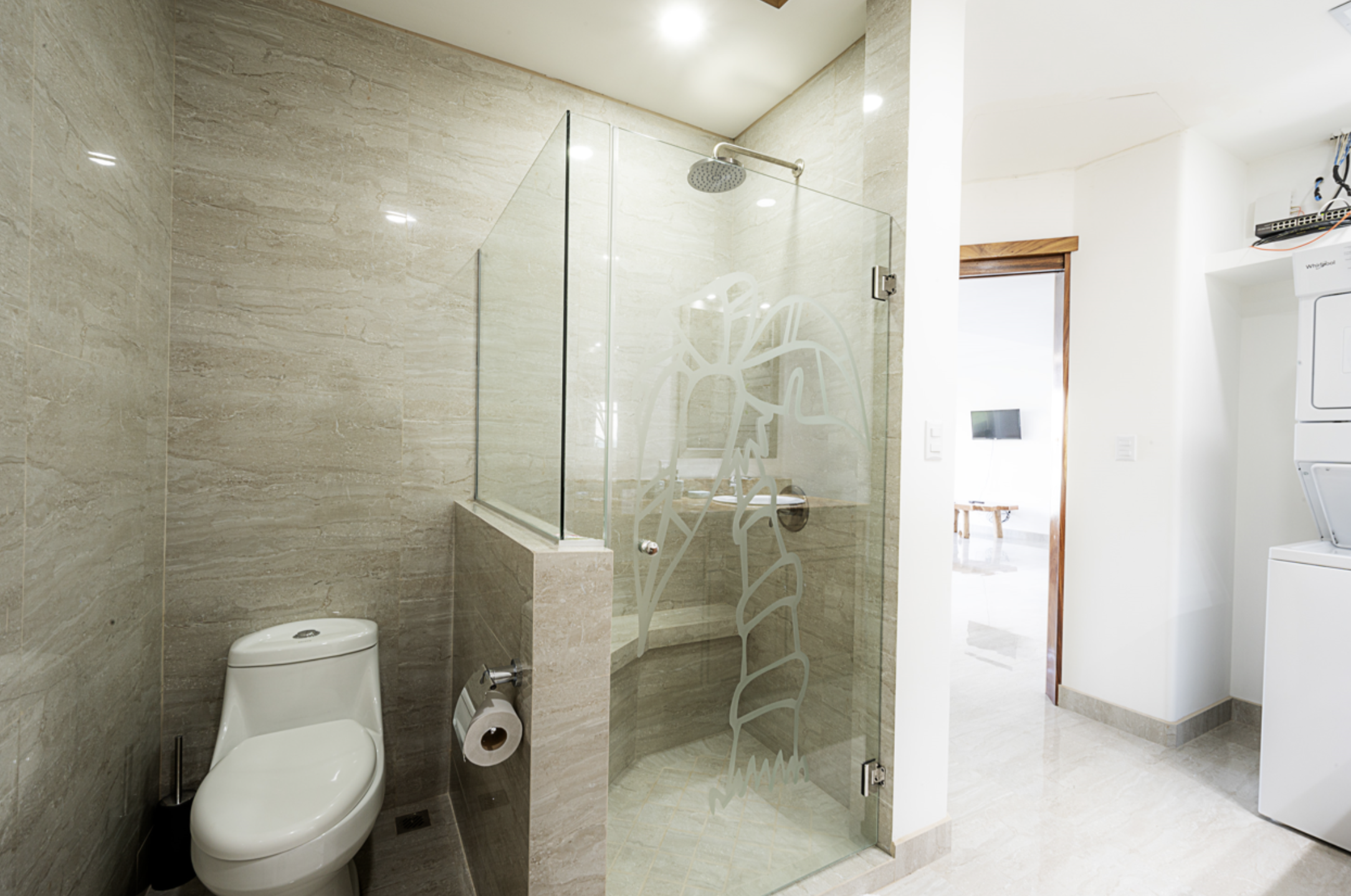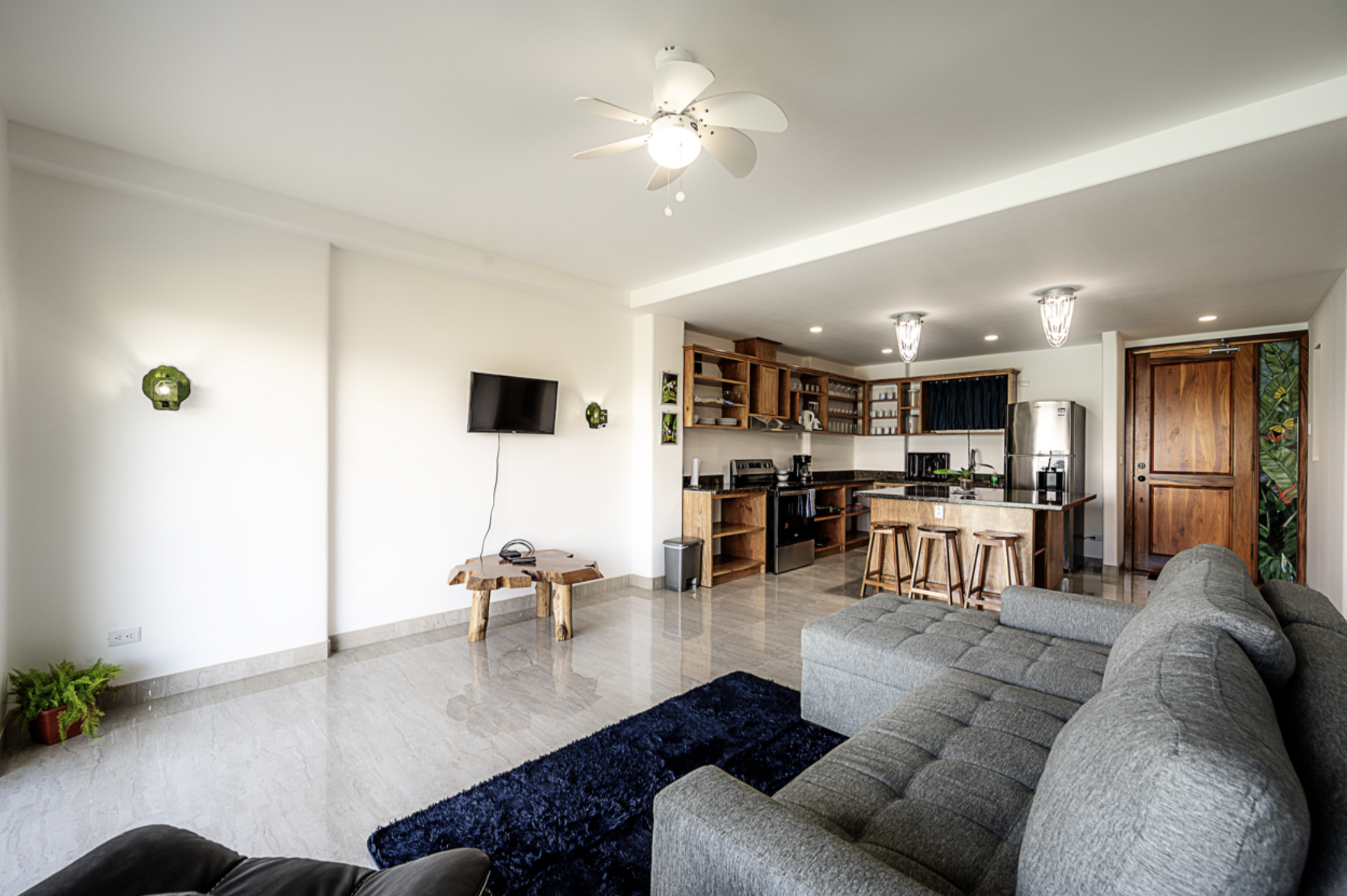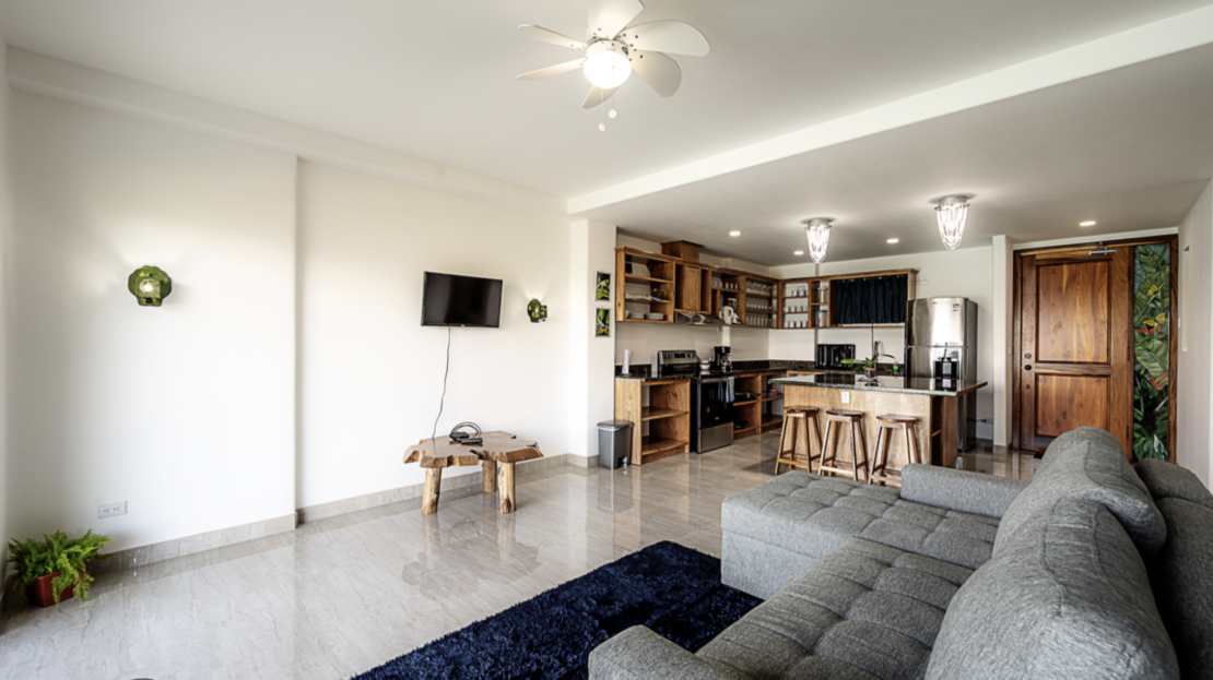 The light and spacious design of this condo begin with the large open plan kitchen and an island breakfast bar, and which opens out onto a living area.