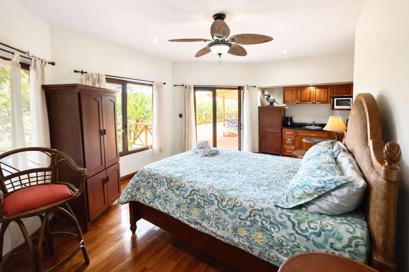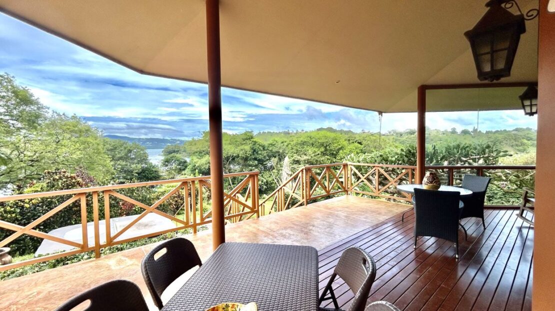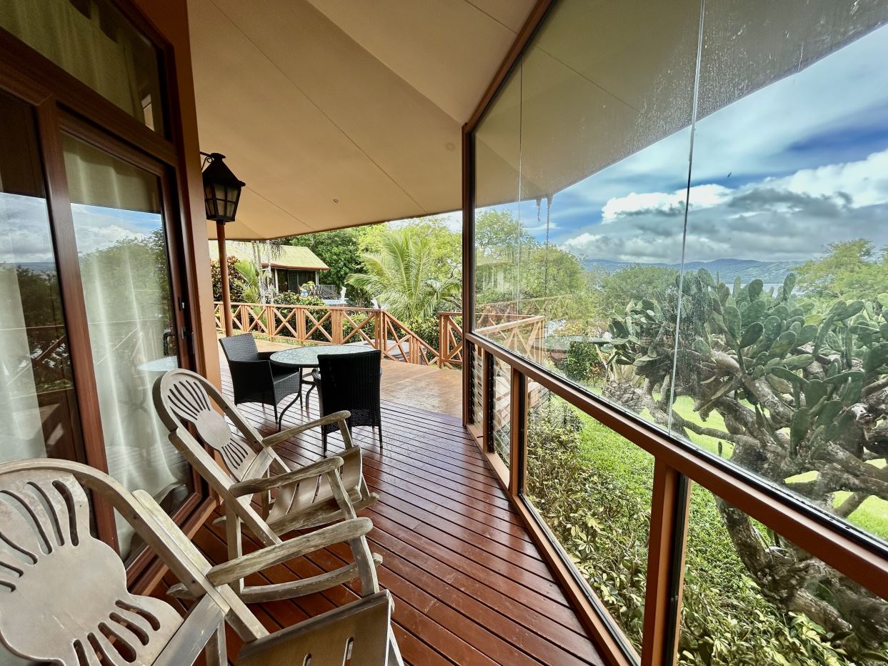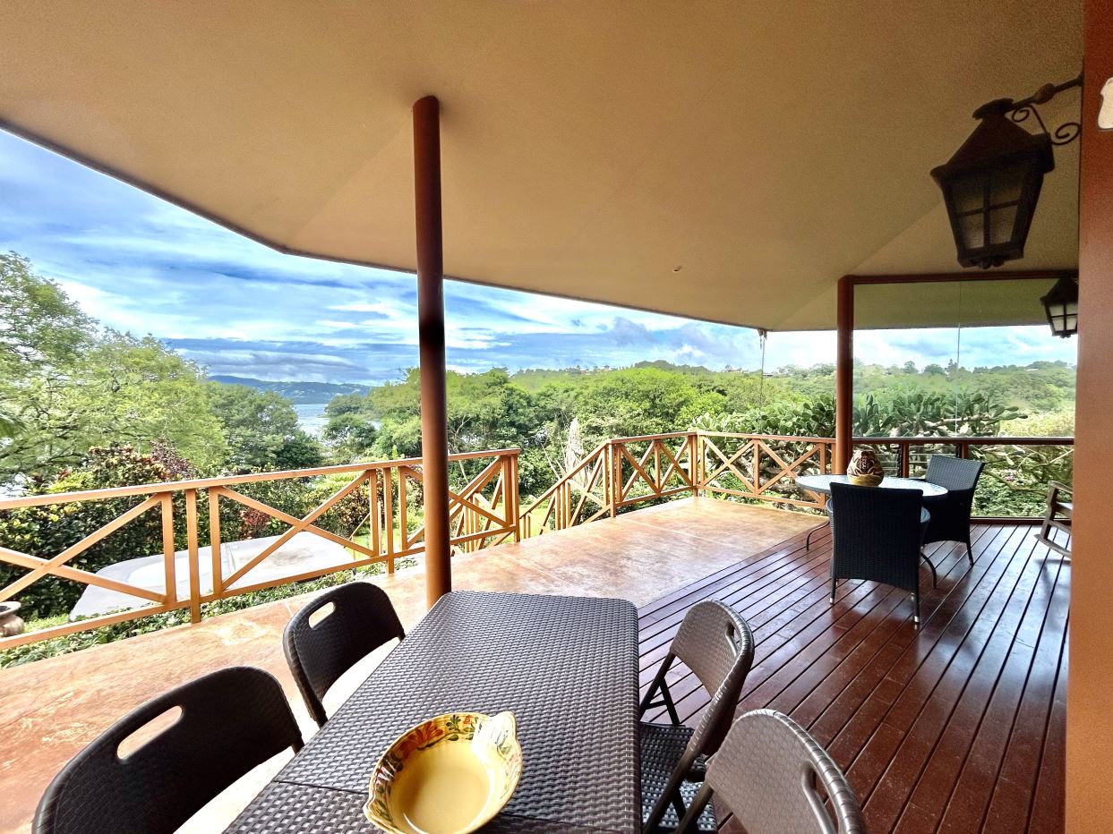This property is offered fully turnkey and comes beautifully furnished to a high standard, with tasteful fixtures, fittings, and accent pieces throughout. The wrap-around covered deck further extends the living experience outdoors, perfect for morning coffee, relaxed afternoons, or entertaining while enjoying sweeping views of Lake Arenal. A section of the covered terrace is enclosed with glass walls, creating a refined, conservatory-like space where the gardens and lake can be enjoyed in comfort even on rainy days. The open covered section provides a lovely setting for outdoor dining and relaxed suppers with friends.