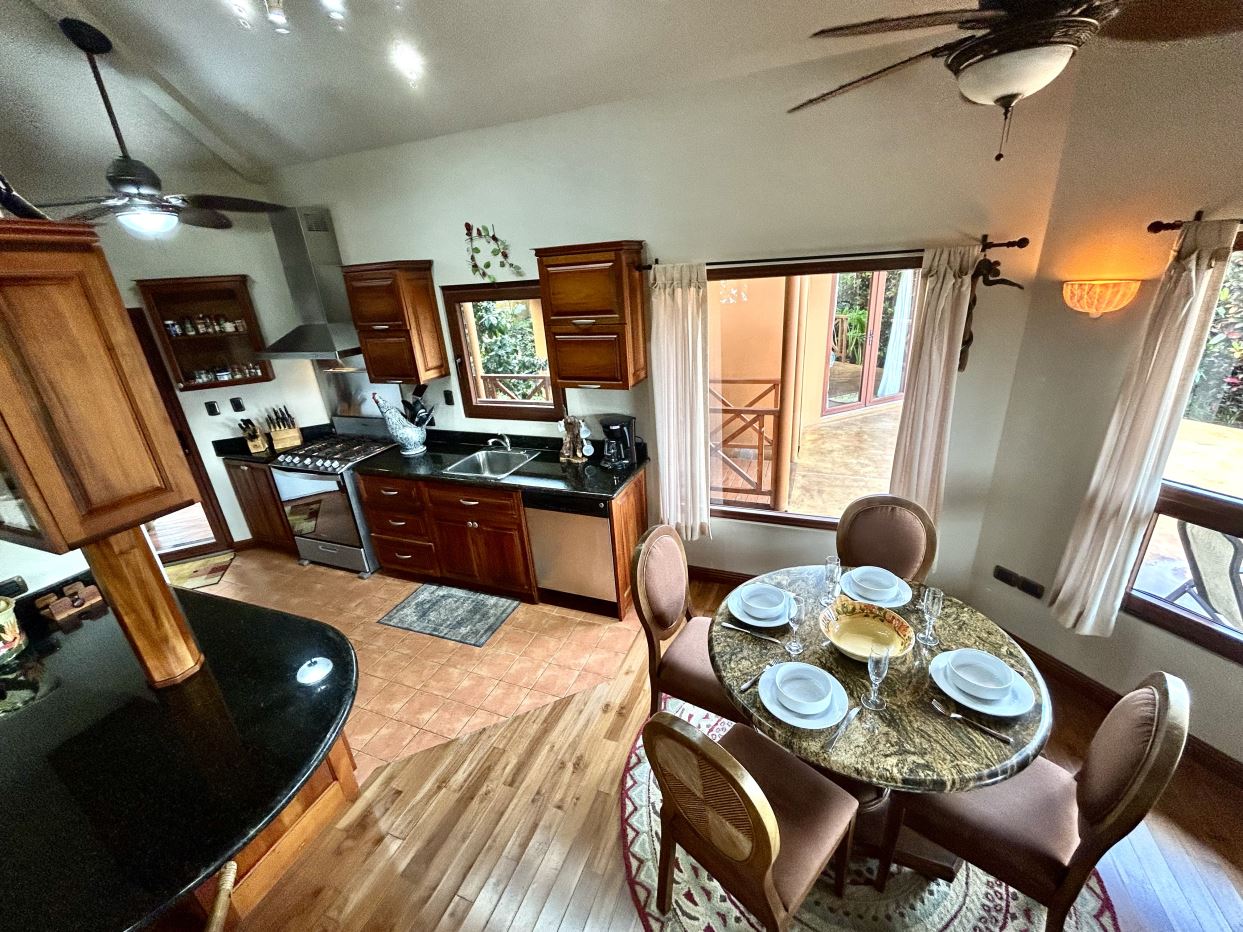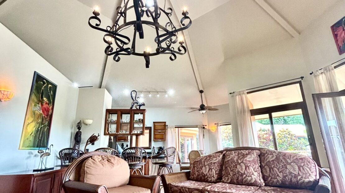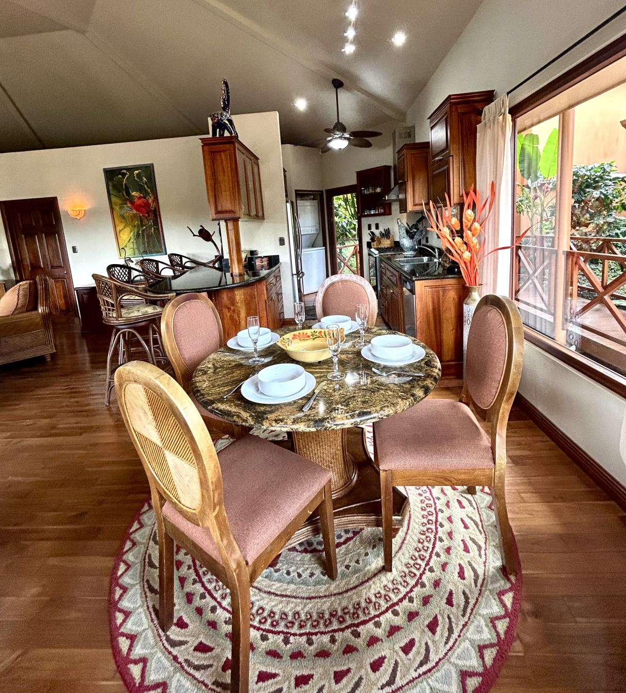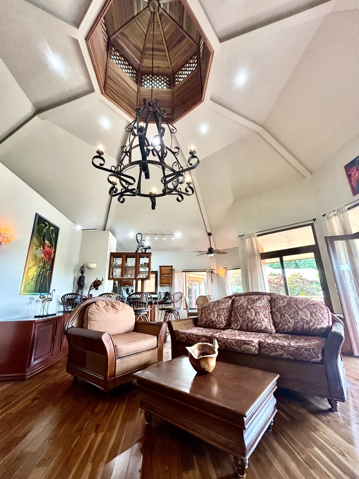 At the heart of the property lies the main residence, showcasing soaring ceilings, exposed wooden beams, and gleaming solid wood floors. The open-concept living space is centered around a stylish, comfortable living room adorned with a central chandelier and an architecturally impressive ceiling. Double patio doors open directly onto the covered terrace, enhancing the home’s indoor–outdoor connection. Just off this central gathering space sits the well-equipped kitchen, featuring granite countertops, custom wood cabinetry, modern stainless-steel appliances, and a generous breakfast bar. Adjacent to the kitchen, the dining area creates a warm, inviting space ideal for conversation and social gatherings.