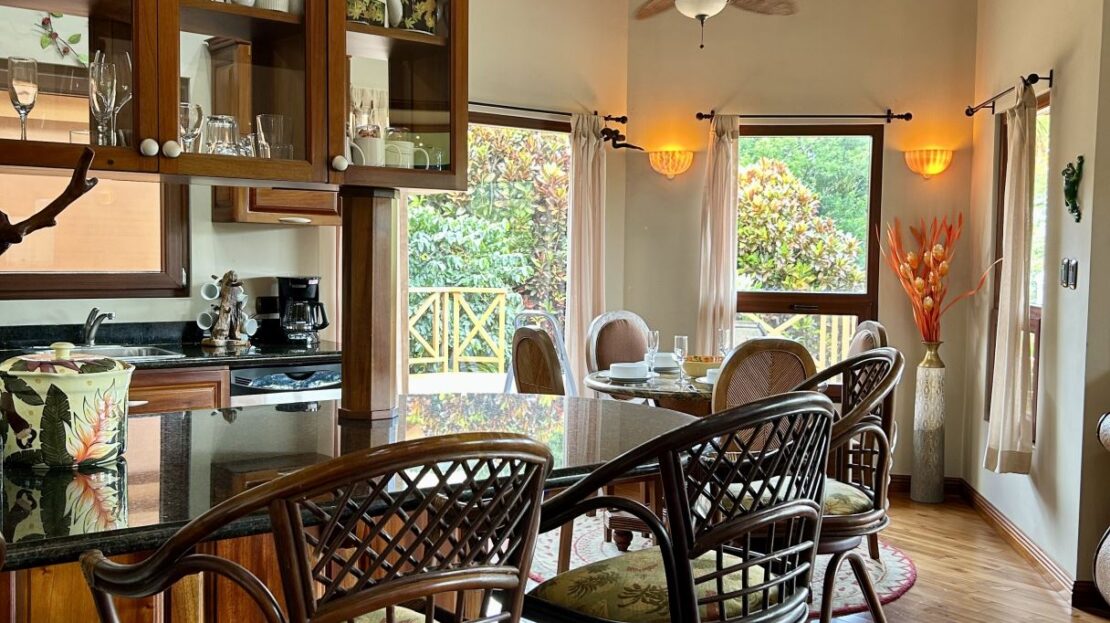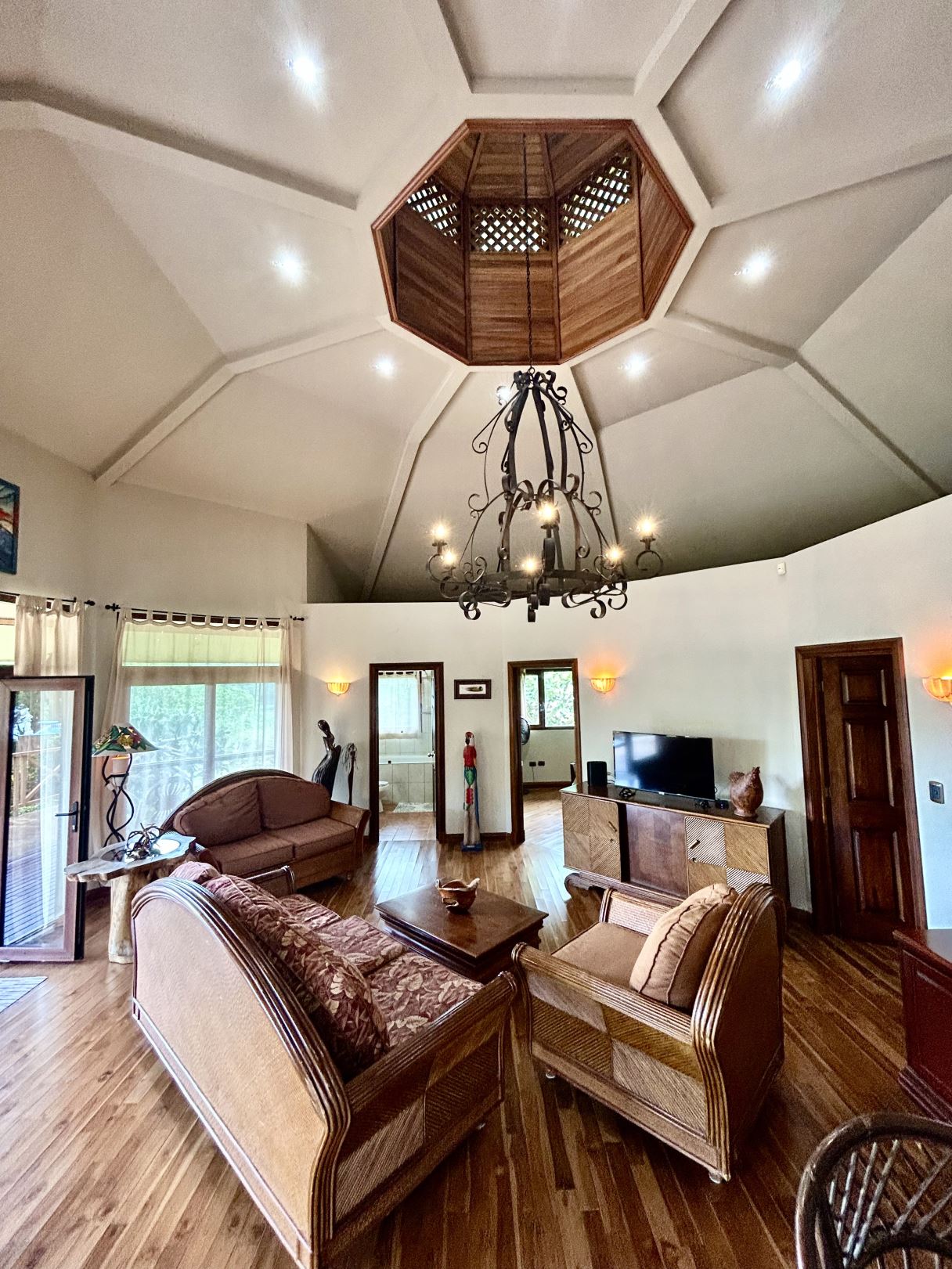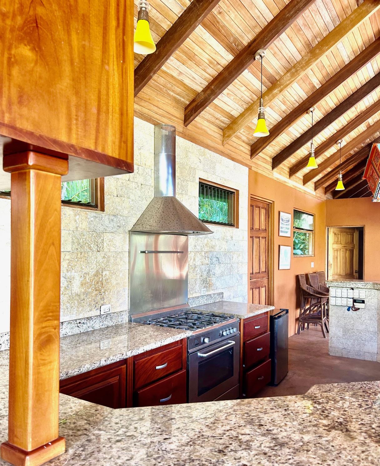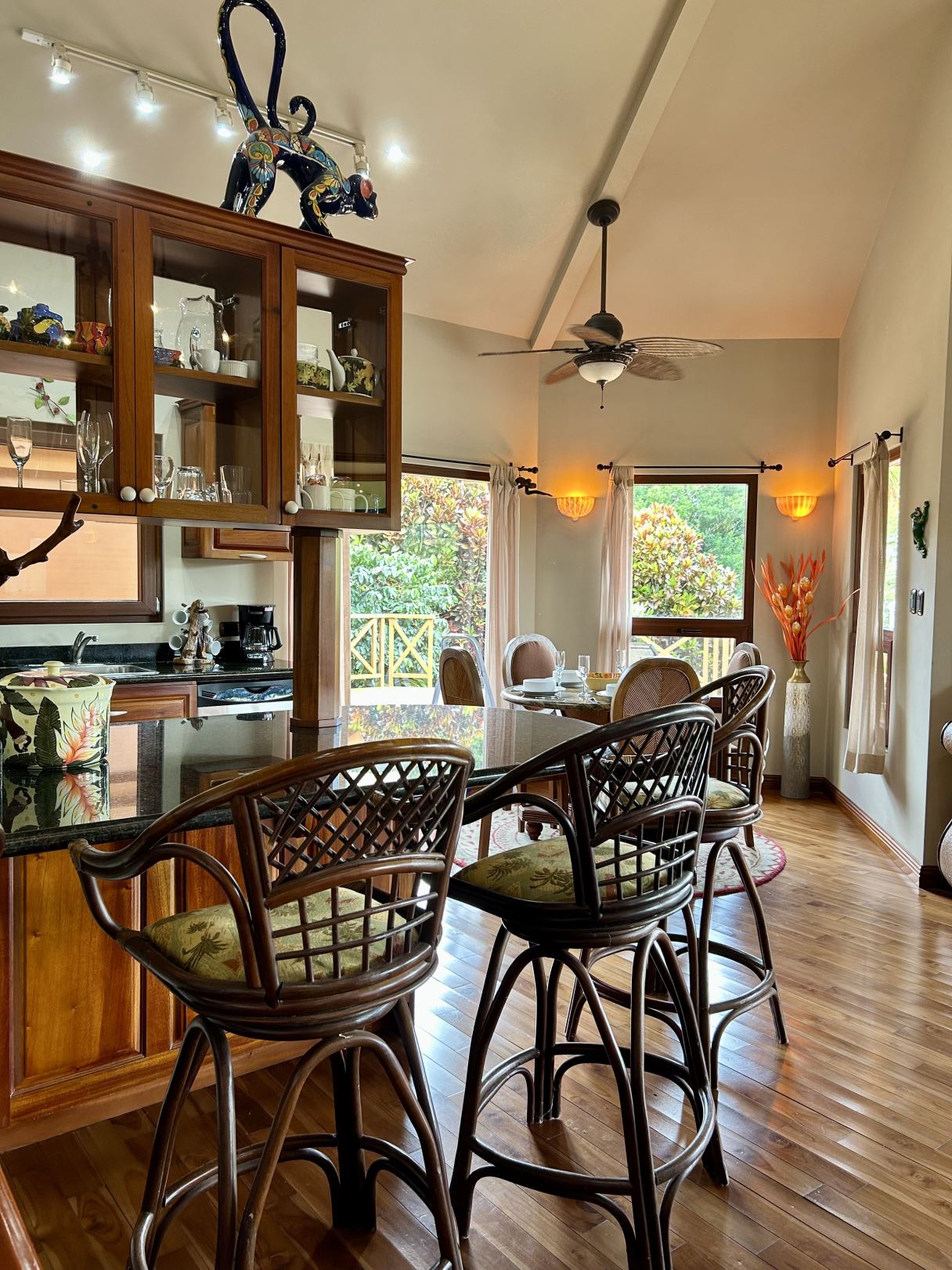 At the heart of the property lies the main residence, showcasing soaring ceilings, exposed wooden beams, and gleaming solid wood floors. The open-concept living space is centered around a stylish, comfortable living room adorned with a central chandelier and an architecturally impressive ceiling. Double patio doors open directly onto the covered terrace, enhancing the home’s indoor–outdoor connection. Just off this central gathering space sits the well-equipped kitchen, featuring granite countertops, custom wood cabinetry, modern stainless-steel appliances, and a generous breakfast bar. Adjacent to the kitchen, the dining area creates a warm, inviting space ideal for conversation and social gatherings.