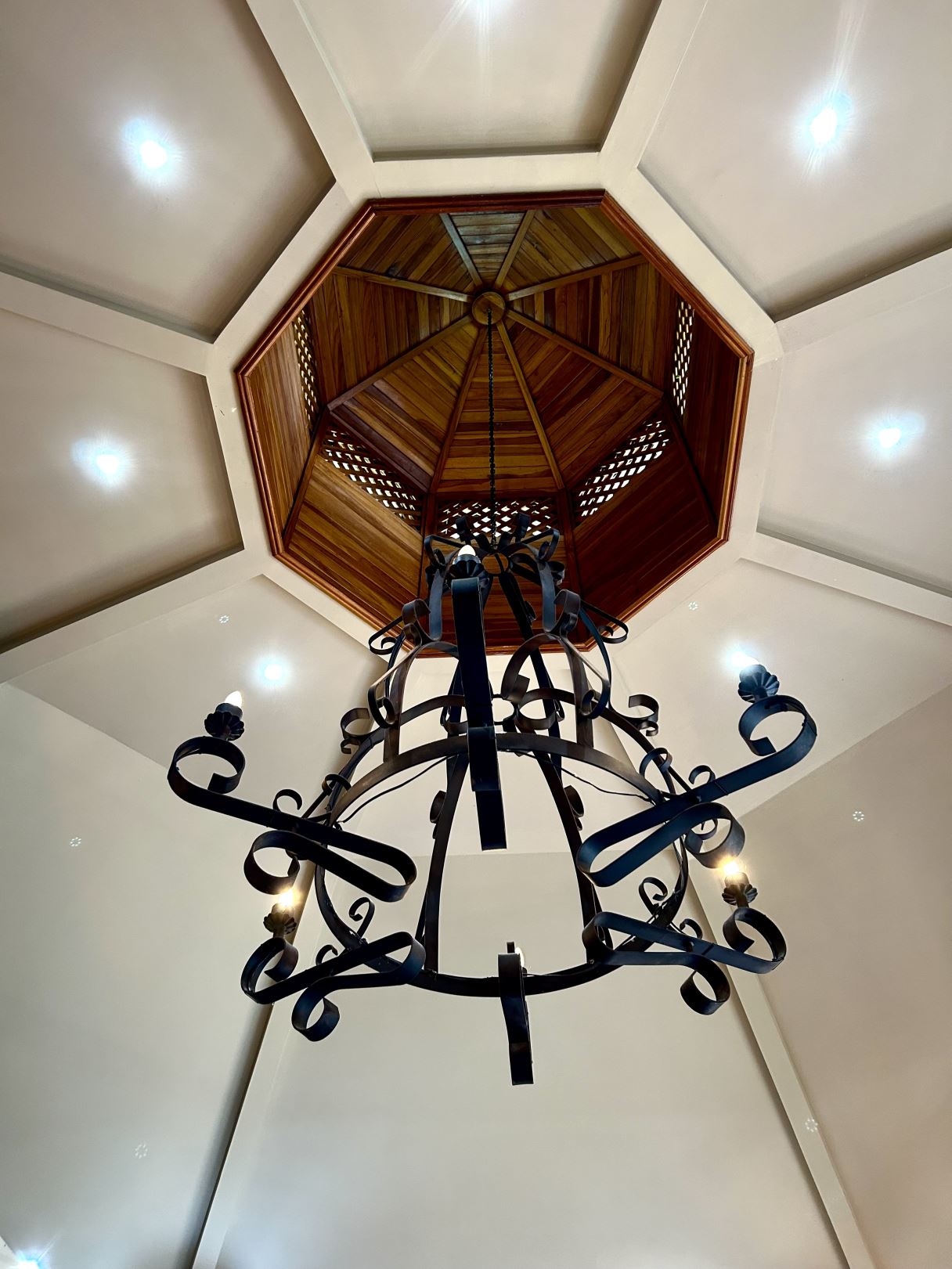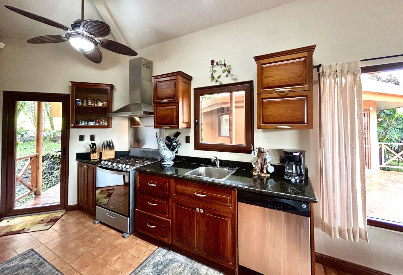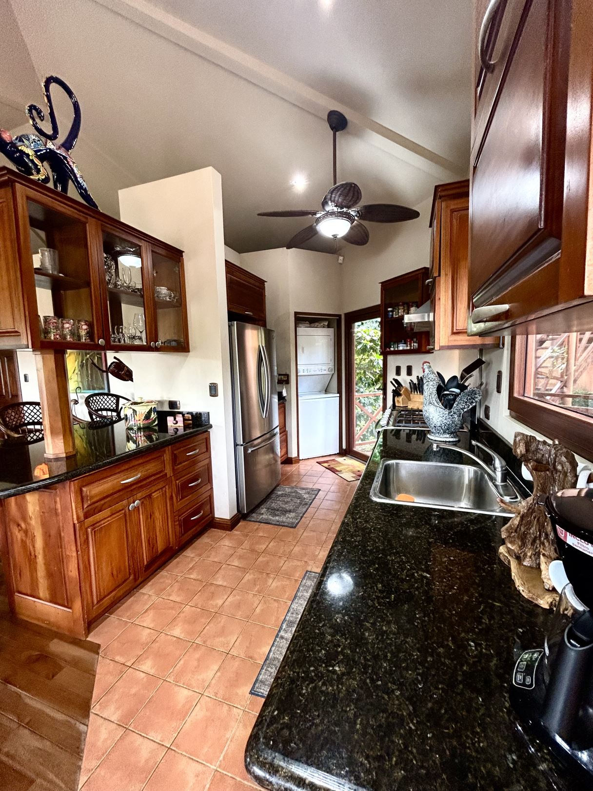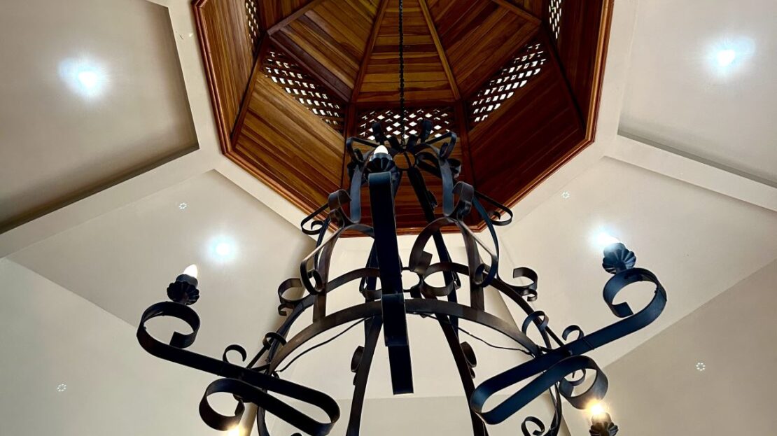 At the heart of the property lies the main residence, showcasing soaring ceilings, exposed wooden beams, and gleaming solid wood floors. The open-concept living space is centered around a stylish, comfortable living room adorned with a central chandelier and an architecturally impressive ceiling. Double patio doors open directly onto the covered terrace, enhancing the home’s indoor–outdoor connection. Just off this central gathering space sits the well-equipped kitchen, featuring granite countertops, custom wood cabinetry, modern stainless-steel appliances, and a generous breakfast bar. Adjacent to the kitchen, the dining area creates a warm, inviting space ideal for conversation and social gatherings.
